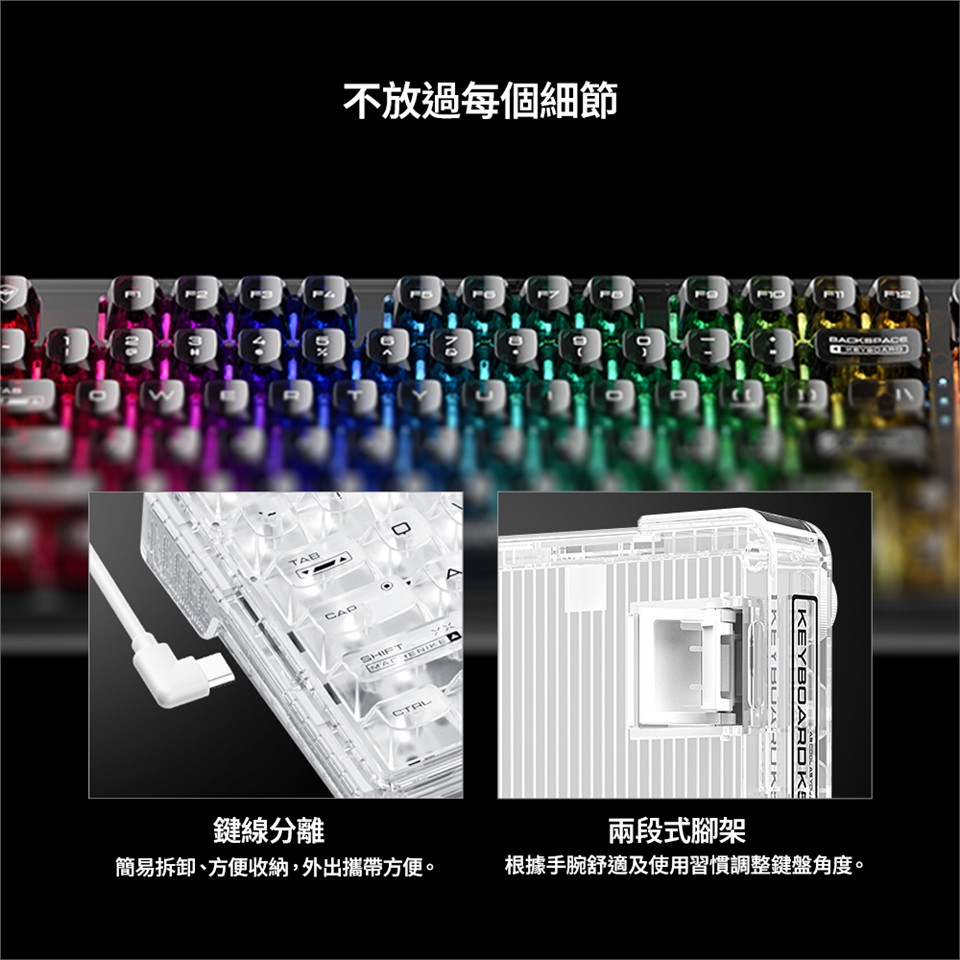 PC 晶透鍵帽,結合 ABS 透明機身,通晶透體。配合RGB燈光效果,透過冰瑩軸體,靈動散射、營造電競遊戲使用情境感。