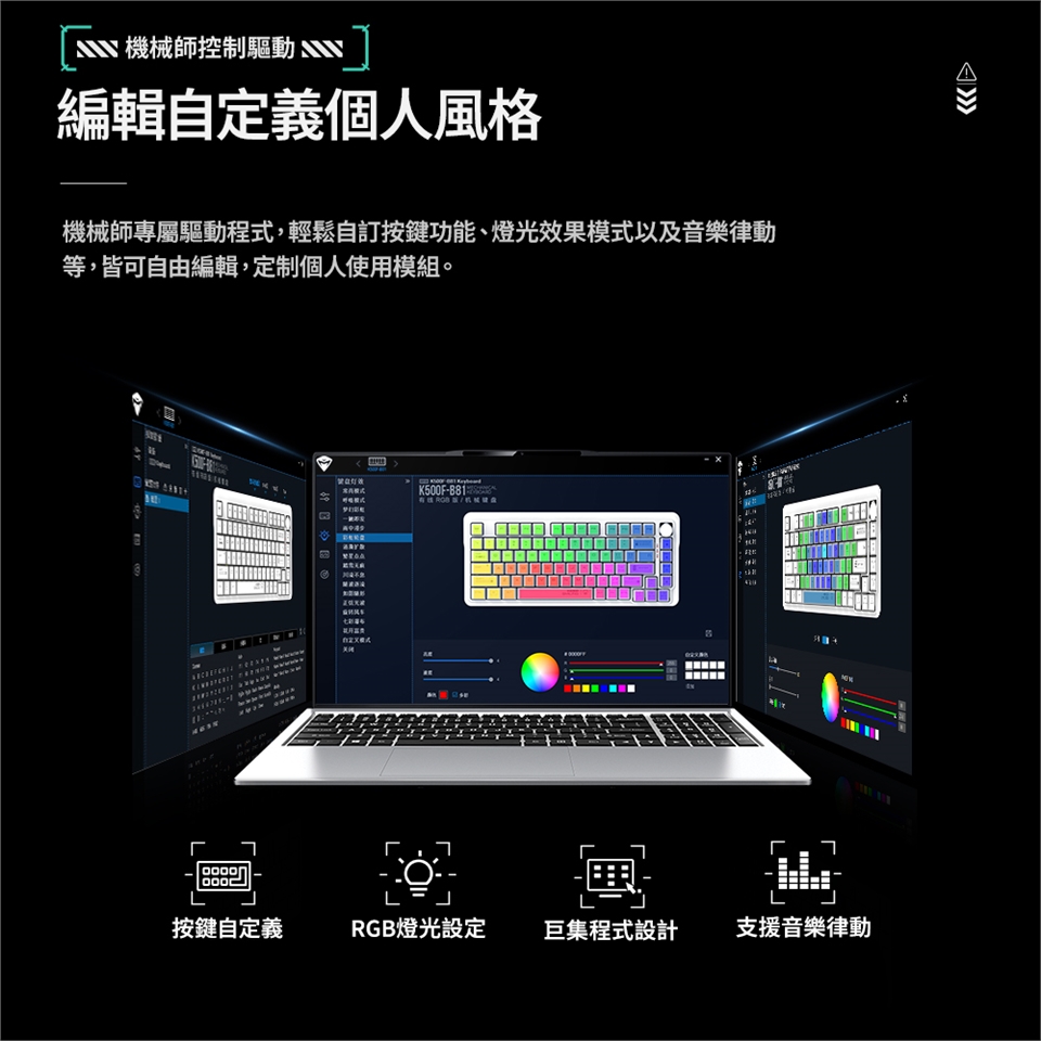 預設16種燈效隨意切換,燈光透過晶透軸體及晶透鍵帽,打造電競情境體驗;支援音樂律動,隨聲舞動燈光秀。