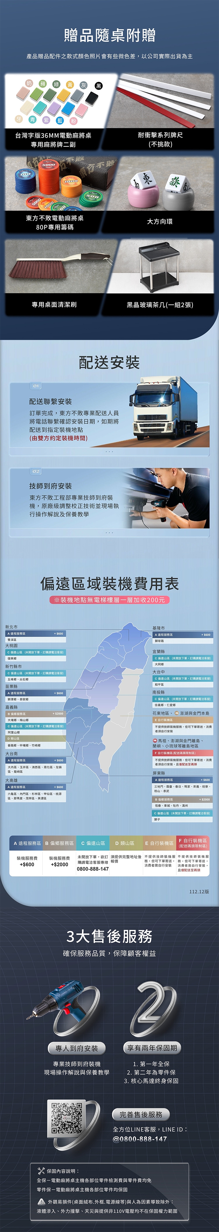 1.產品由東方不敗公司專業人員到府安裝、操作、保養教學。除花東、離島地區、偏遠地區(若可自行搬運例外)無法專人到府配送,其他縣市均到府配送。