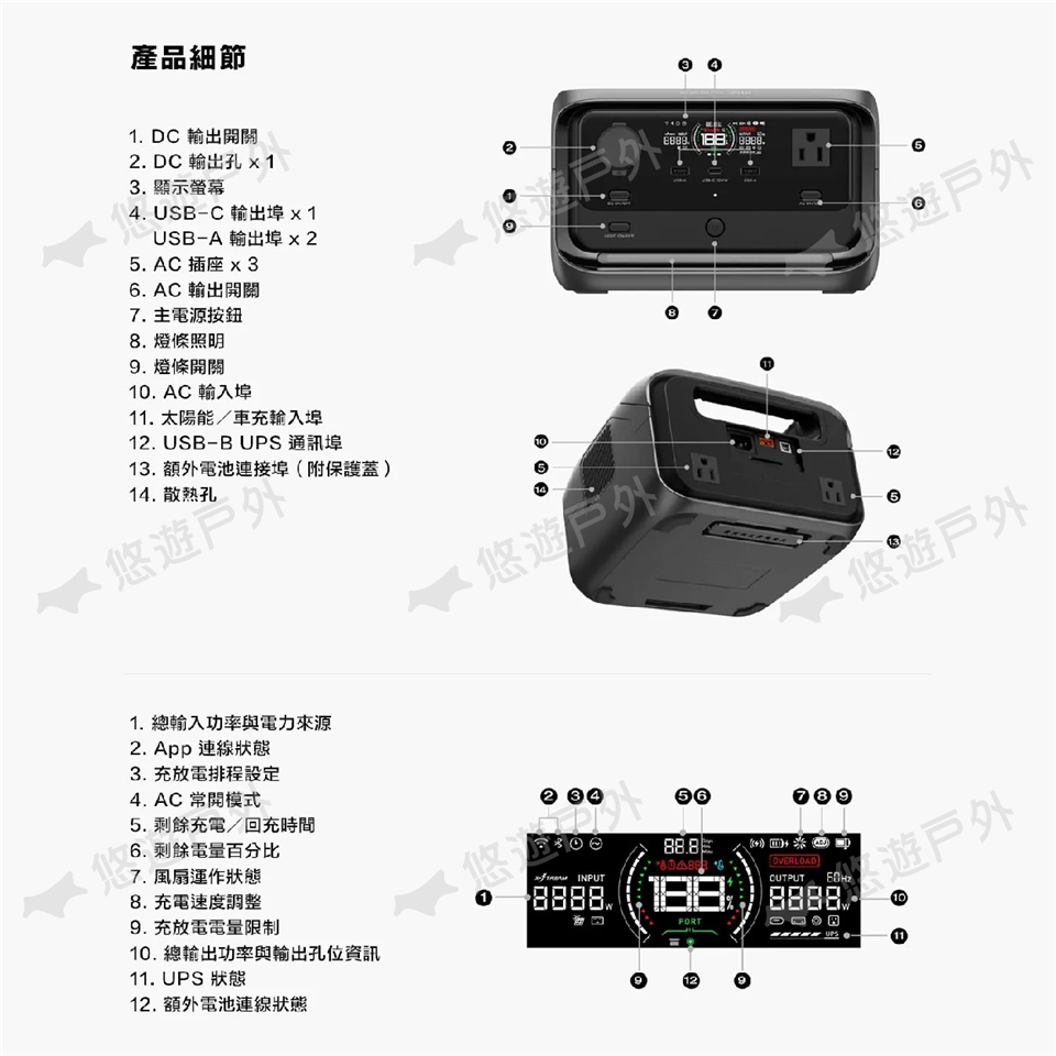 AC輸出:3組插座,總功率600W(瞬間1200W,X-Boost可達1200W)