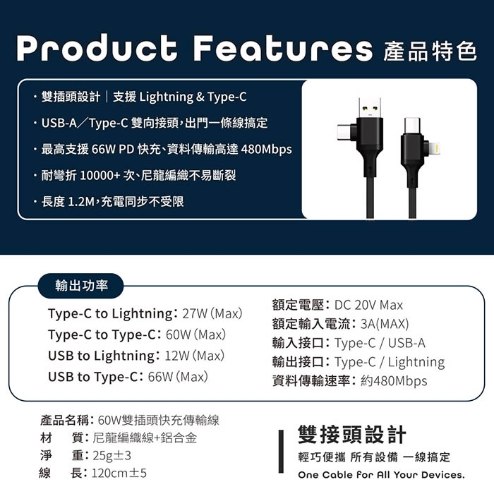 產品名稱:60W雙插頭快充傳輸線