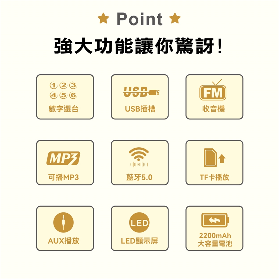 ◆可播放藍牙/USB/TF/外部音源/收音機功能