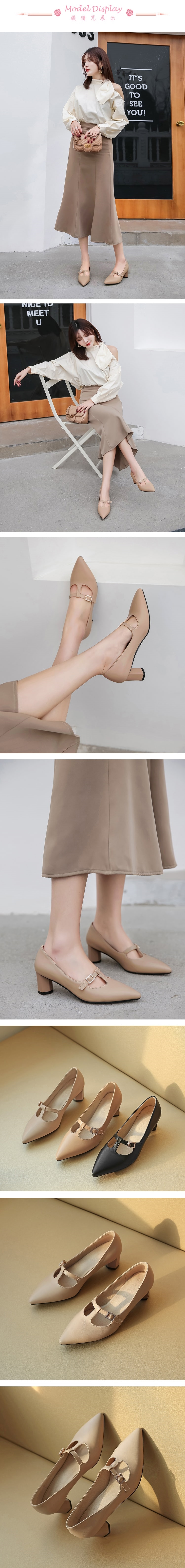 【Kissxxx】尖頭T字釦帶異形粗跟鞋/復古尖頭T字釦帶造型異形粗跟鞋 女鞋 米