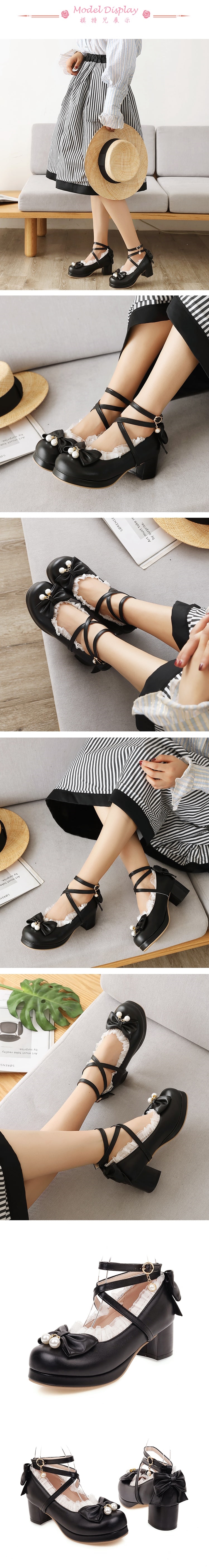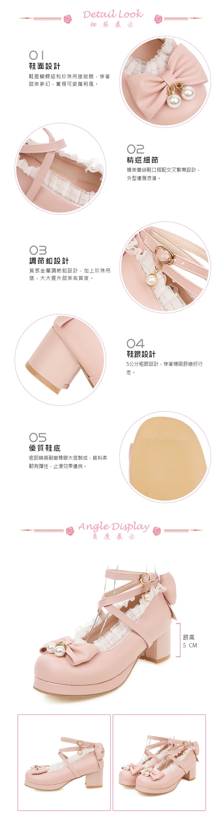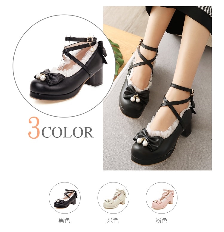 【Kissxxx】蕾絲蝴蝶結珍珠瑪莉珍粗跟鞋/唯美蕾絲鞋口可愛蝴蝶結珍珠墜交叉繫帶瑪莉珍粗跟鞋 女鞋 黑