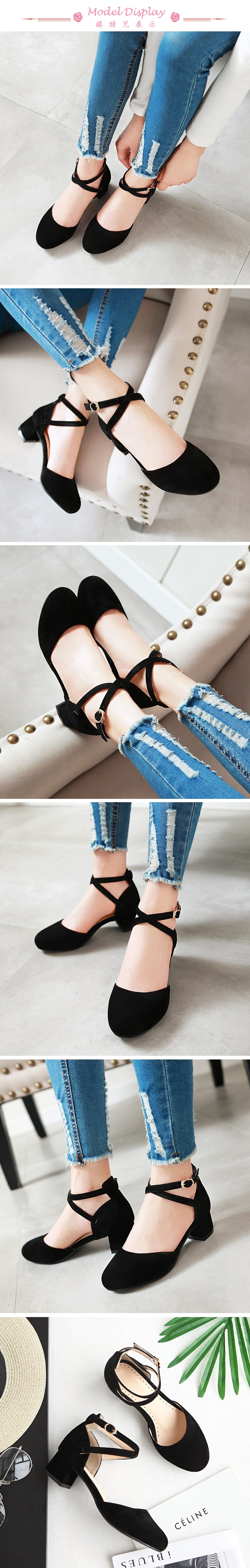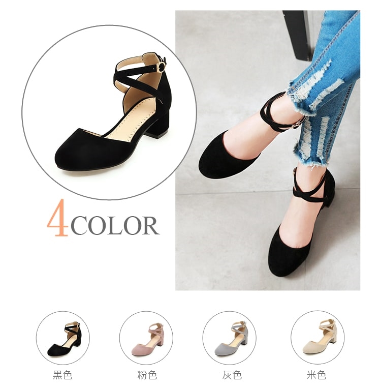 【Kissxxx】磨砂皮交叉粗跟涼鞋/小圓頭淺口質感磨砂皮革交叉繫帶粗跟涼鞋 女鞋 黑