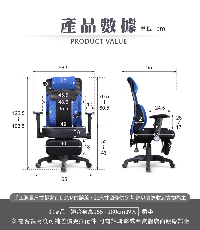 坐高43 ~ 52cm、坐寬49cm、坐深47cm(無腰枕) 、坐深39cm(有腰枕)