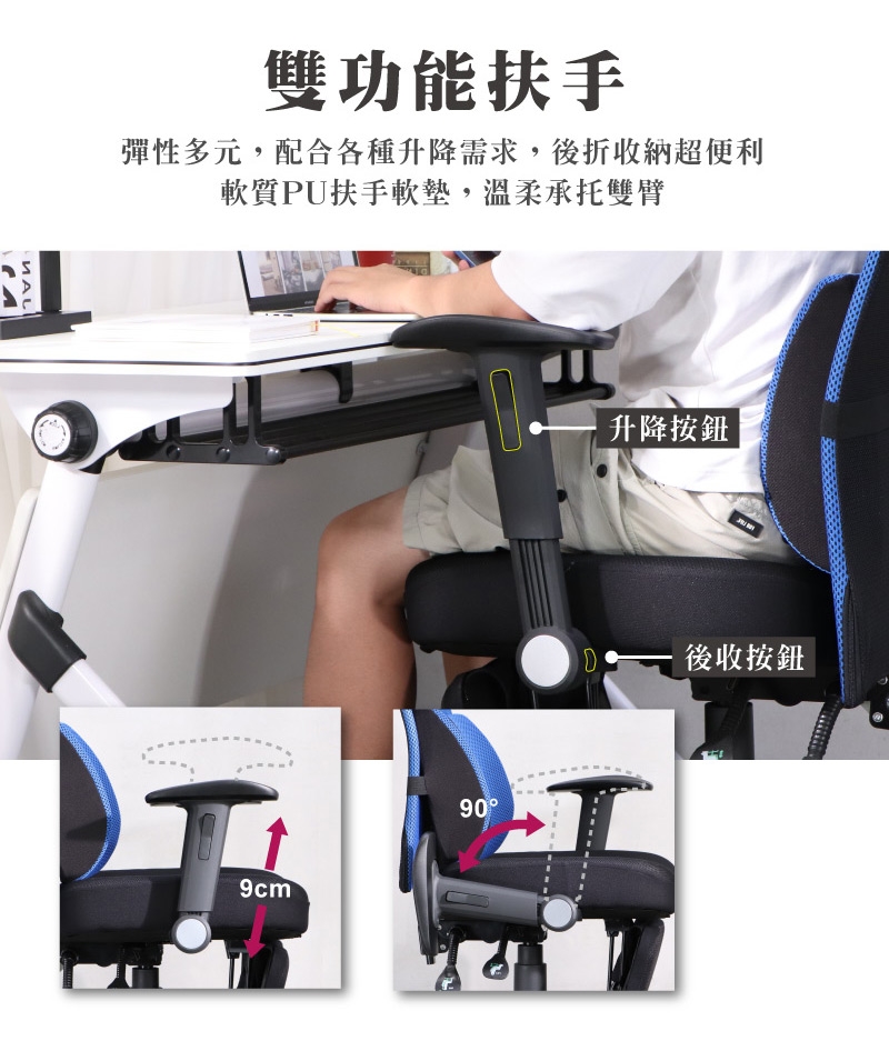 配合升降需求,後折收納超便利,軟質PU扶手軟墊,溫柔承托雙臂