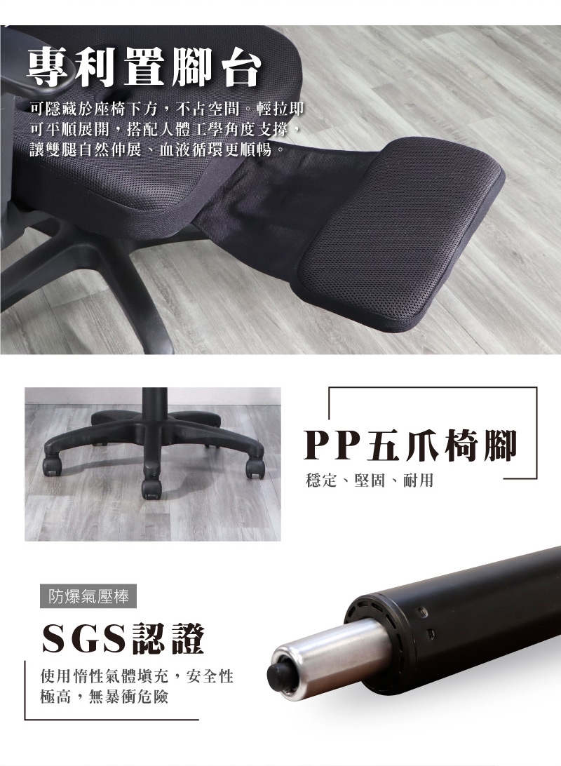 可隱藏於座椅下方,不占空間。輕拉即可平順展開,搭配人體工學角度支撐,