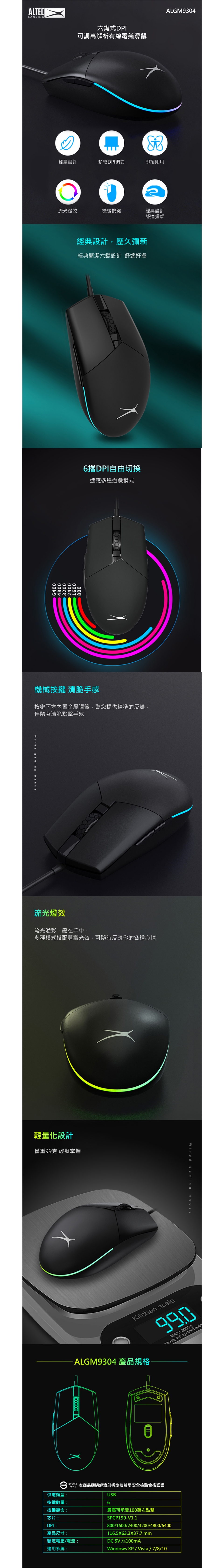 ALTEC LANSING 六鍵式DPI可調高解析有線電競滑鼠 ALGM9304 黑