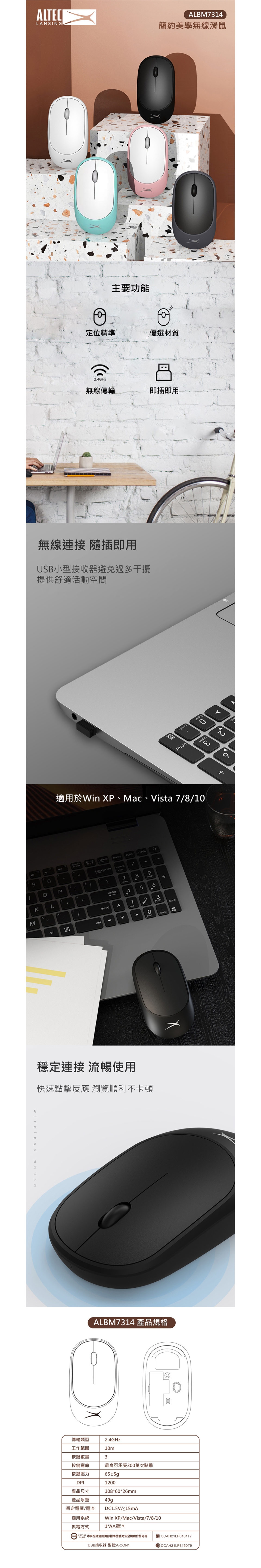 ALTEC LANSING 簡約美學無線滑鼠 黑/粉/青/灰/白 ALBM7314