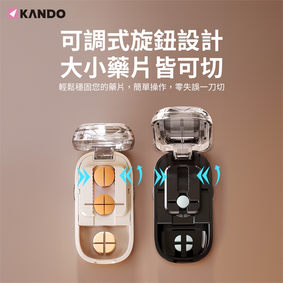 - 可調式旋鈕設計,讓您可以根據藥片尺寸做調整,靈活度滿分,精準切割大小不同的藥片。