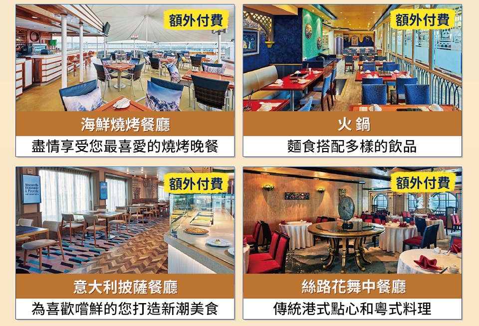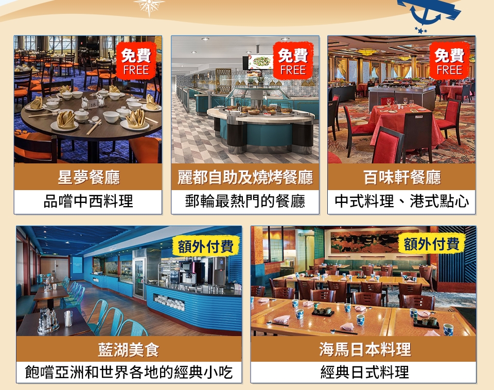 ※ 本行程表內所介紹之各項設施僅供參考,若郵輪上增加或關閉各項設施請恕不另行通知,均依登船後郵輪公司每日所提供之【麗星郵輪 探索星號情報】為準。