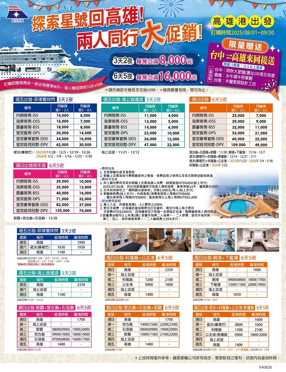 ●每間艙房不得全部更換名單,否則視為取消並需重新訂位。
