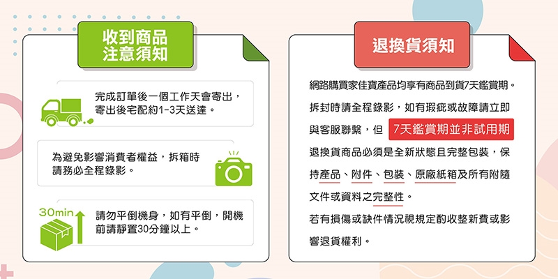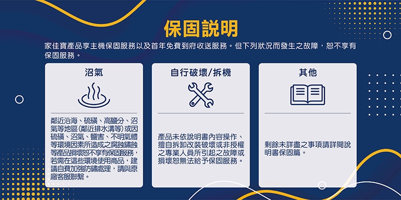 -本商品享有3年保固,若因人為因素、環境因素或外力等因素造成商品故障或配件消耗品不在保固範圍內。