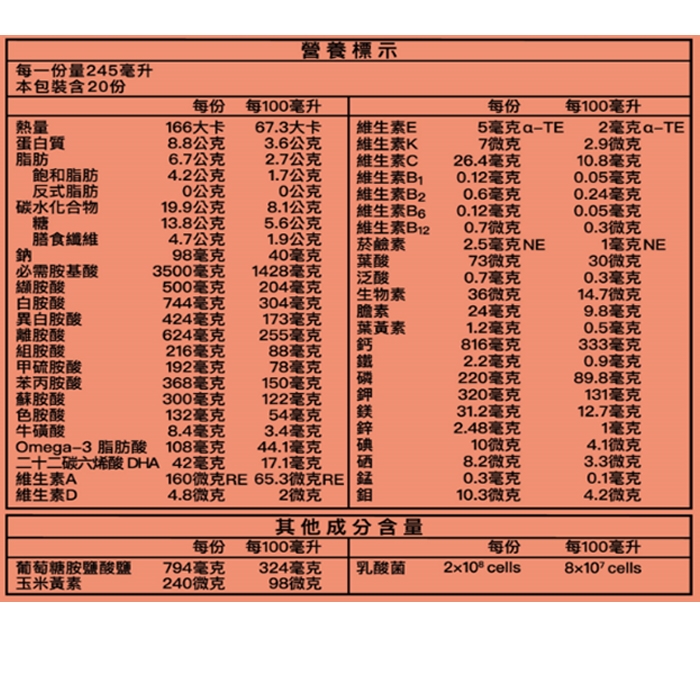 內容物成份 全脂奶粉、脫脂奶粉、難消化性麥芽糊精、碳酸鈣、葡萄糖酸鈣、麥芽糊精、脫鹽乳清粉、魚油(含DHA)(魚油、葡萄糖漿、葡萄糖、卵磷脂)、濃縮乳清蛋白(含免疫球蛋白)、磷酸鎂、維生素C、重酒石酸膽鹼、葉黃素[麥芽糊精、阿拉伯膠、葉黃素、混合濃縮生育醇(抗氧化劑)、二氧化矽、L-抗壞血酸棕櫚酸酯(抗氧化劑)]、卵磷脂、維生素E、葡萄糖酸鋅、焦磷酸鐵、牛磺酸、金盞花萃取物(含玉米黃素)(麥芽糊精、阿拉伯膠、金盞花萃取物)、乳酸菌粉(糊精、乳酸菌Lactobacillus plantarum L-137)、鋅酵母、維生素D₃、硒酸鈉、茄紅素胺、維生素B₁₂、維生素A、維生素B₂、本多酸鈣、維生素K₁、維生素B₁、維生素B₆、葉酸、碘化鉀、生物素、磷酸鈉。