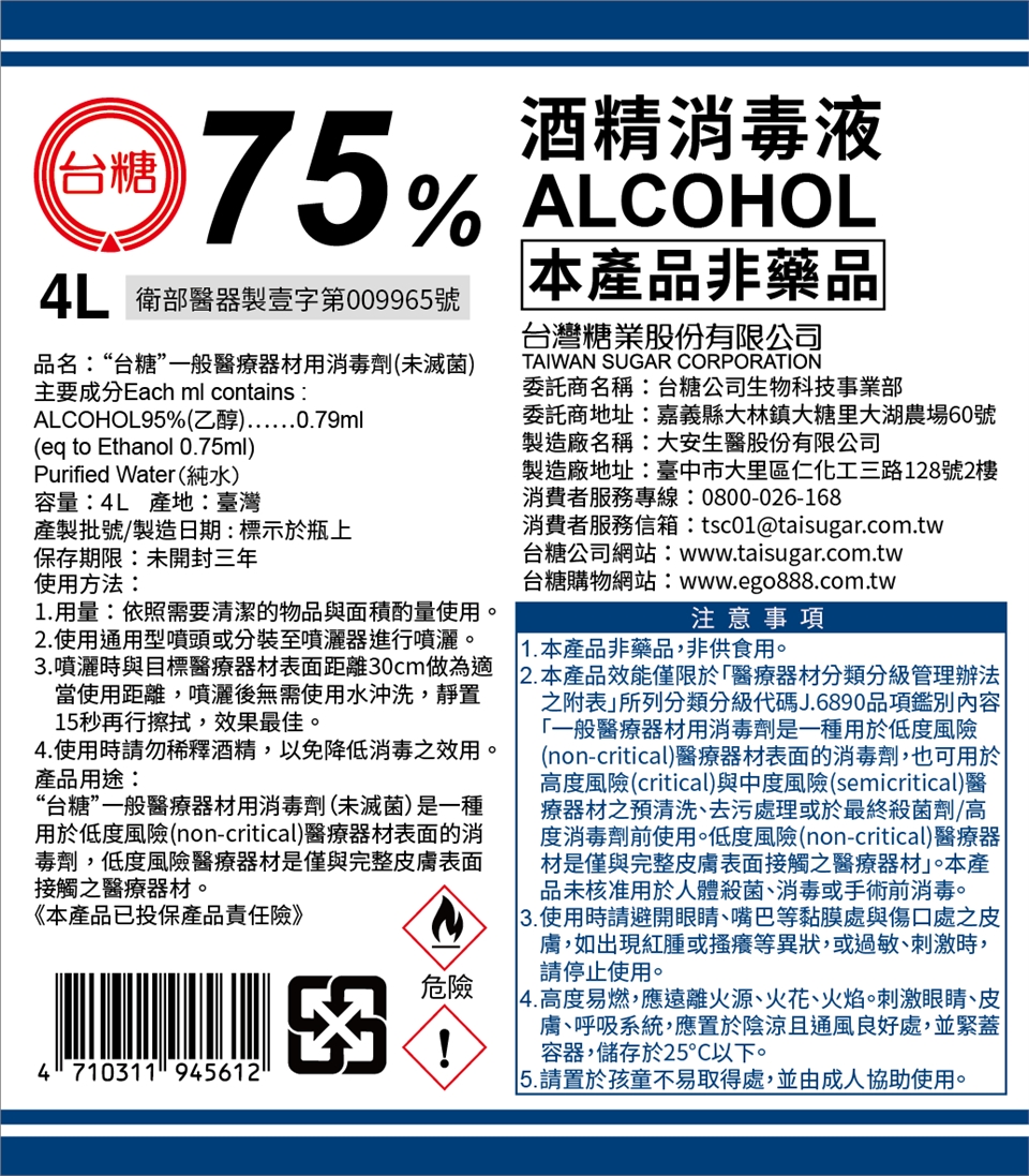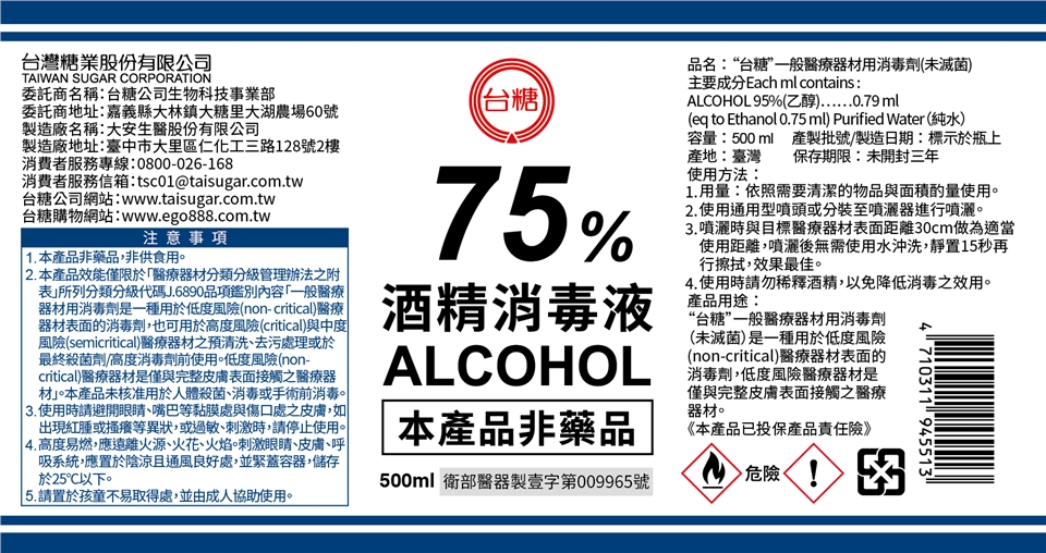 「“台糖”75%酒精消毒液,原料乙醇符合國家品質規範『中華民國國家標準CNS食用酒精 15351 N5256』檢驗規定。」