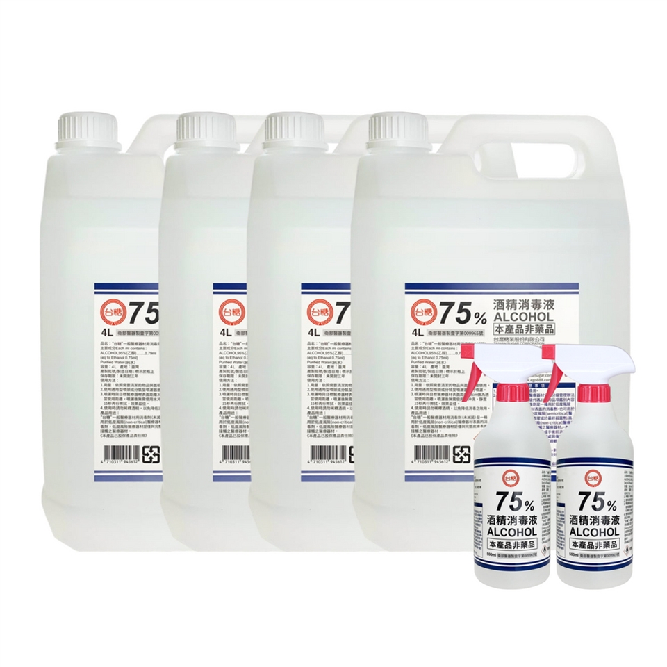 1、商品組合/規格:“台糖” 75%酒精消毒液4桶+2瓶組合+酒精專用噴頭2支