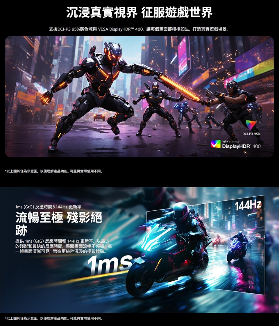 - 1ms (GTG)反應速度/ 144Hz 更新率