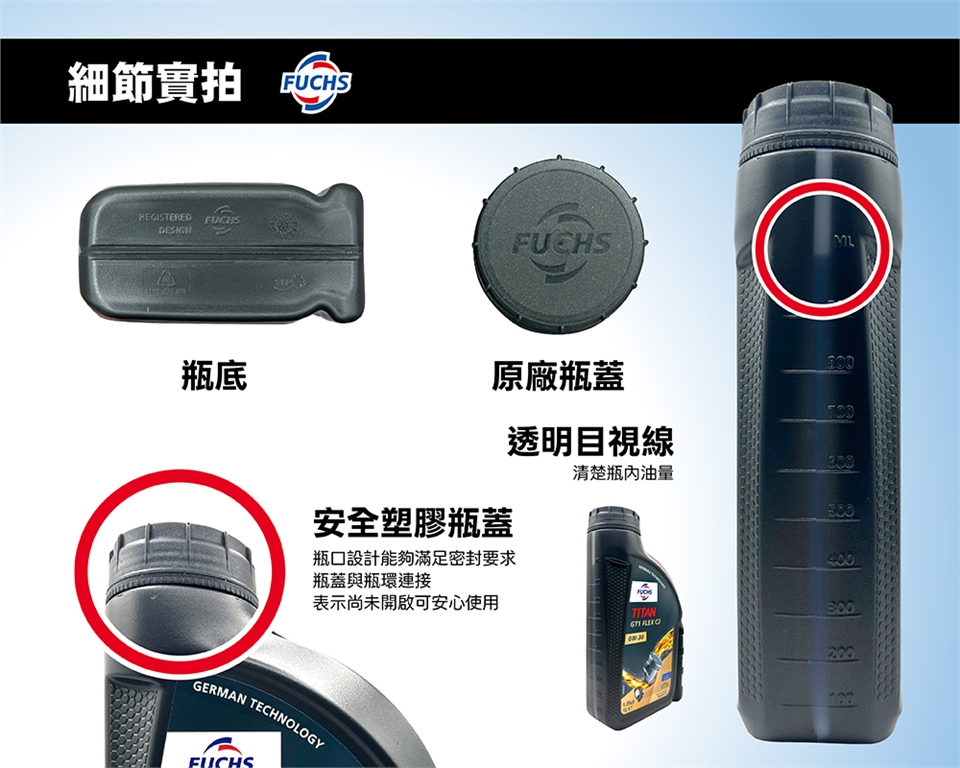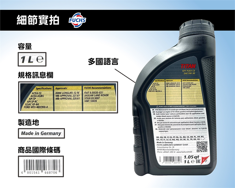 FUCHS TITAN GT1 FLEX C2 0W30 全合成機油,符合 API SP、ACEA C2/A5B5、ILSAC GF-6A 標準,BMW Longlife-12 FE、MB 229.61 認證,適合渦輪增壓與柴油 Hybrid 引擎。