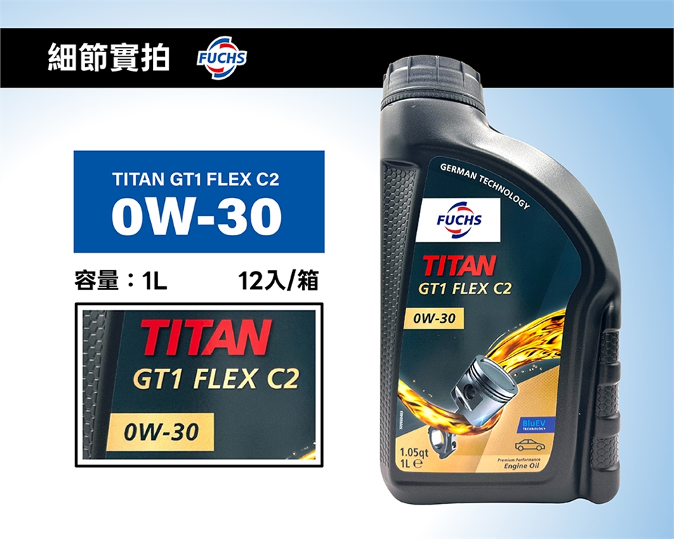 FUCHS TITAN GT1 FLEX C2 SAE 0W30,全合成高效能機油,具備 API SP、ACEA C2/A5B5、ILSAC GF-6A 規範,並通過 BMW Longlife-12 FE、MB 227.61/229.61 認證。