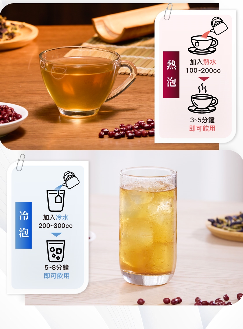冷熱沖泡皆可,依喜好調整沖泡時間及水量,味道足夠可拿起茶包,約100-200CC,每日建議1-2包