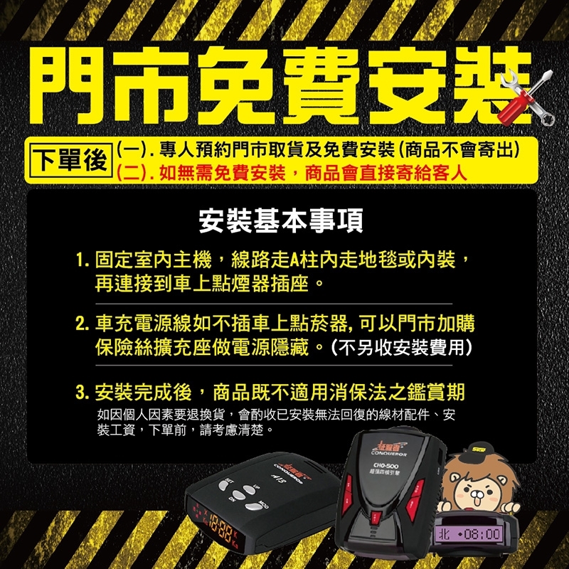 標準配件:防護片連結線、車外控制盒電源線、車內語音盒電源線、水平調整管、固定架與螺絲組、產品保固卡、南極星 HP-6 使用手冊