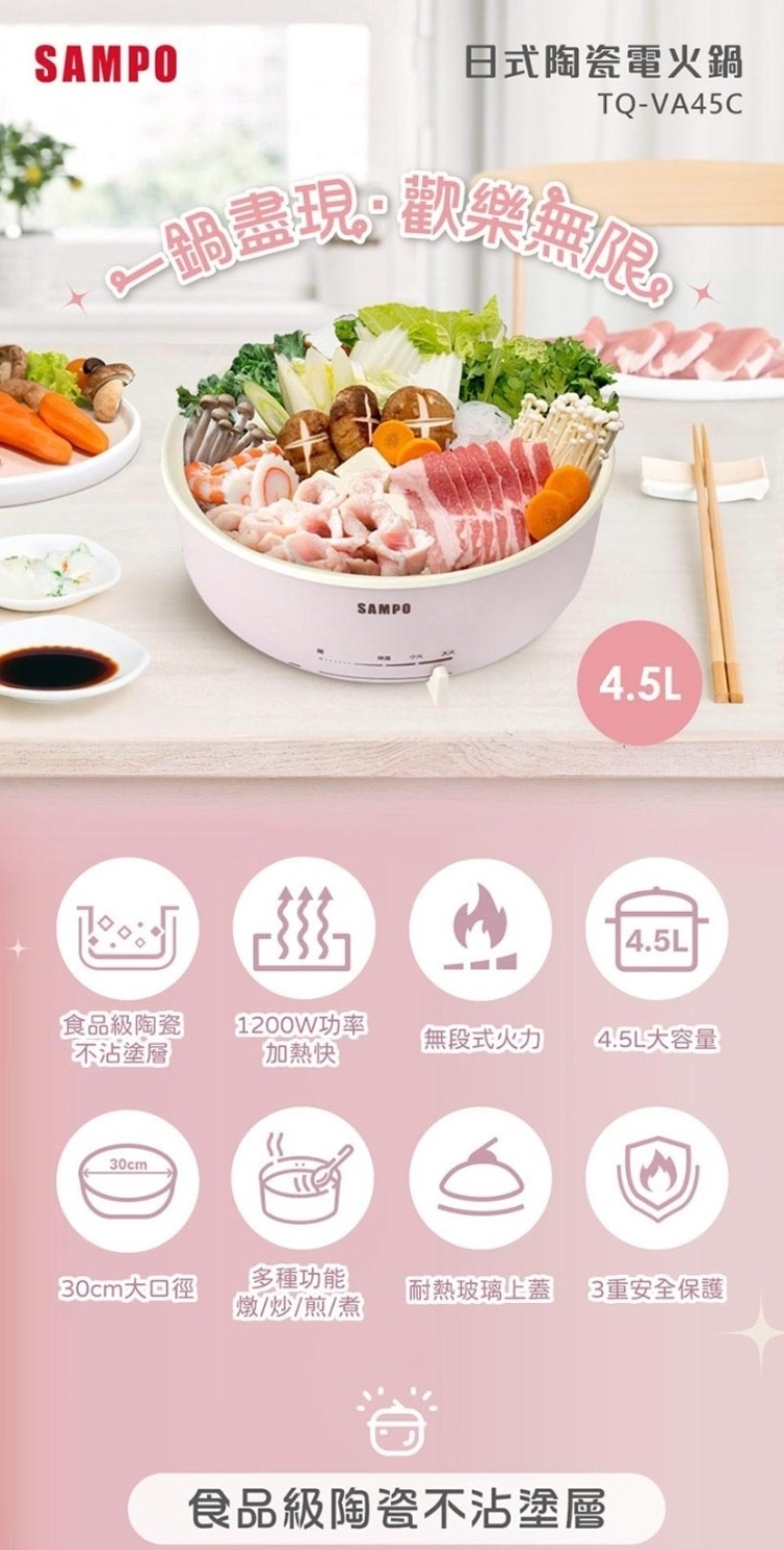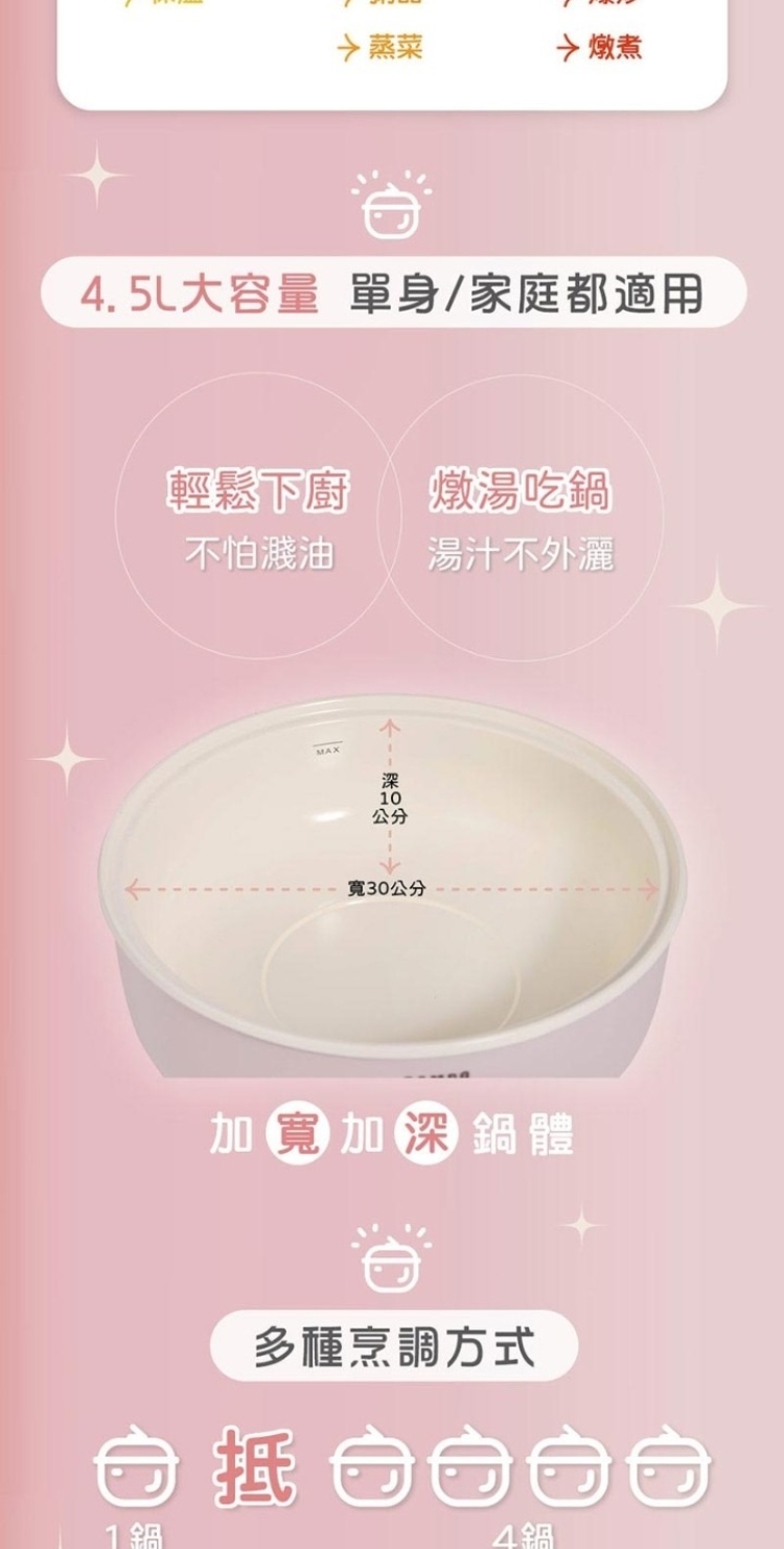 ★ 30cm大口徑+10cm深度,4.5L大容量滿足一家人味蕾