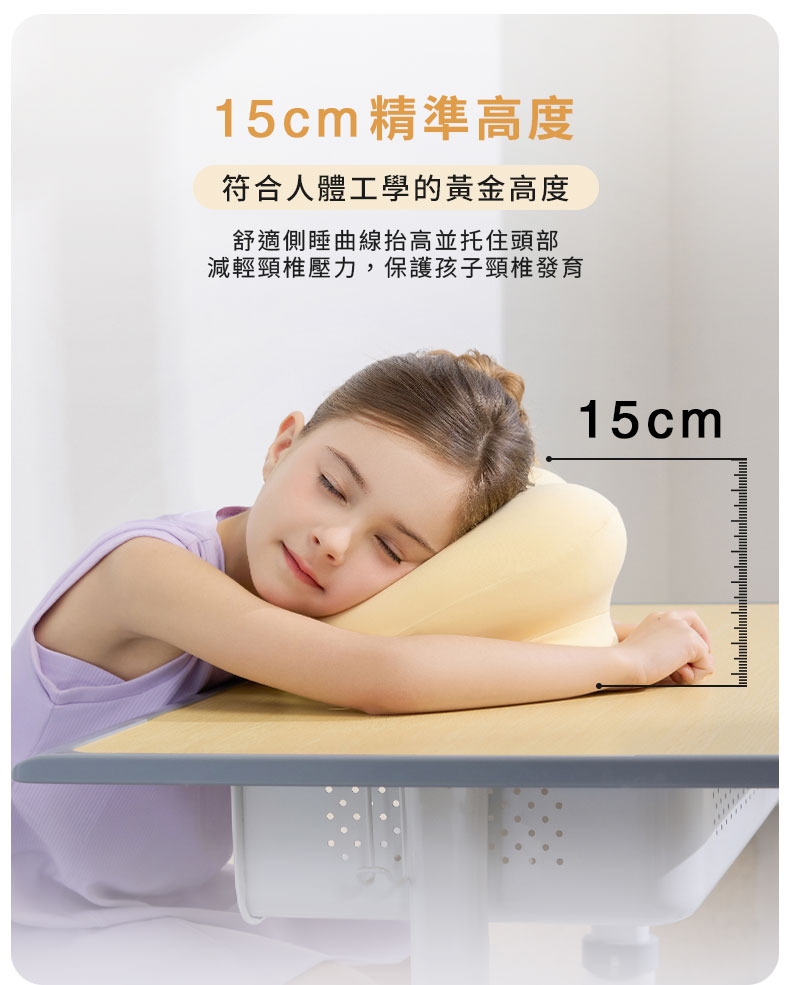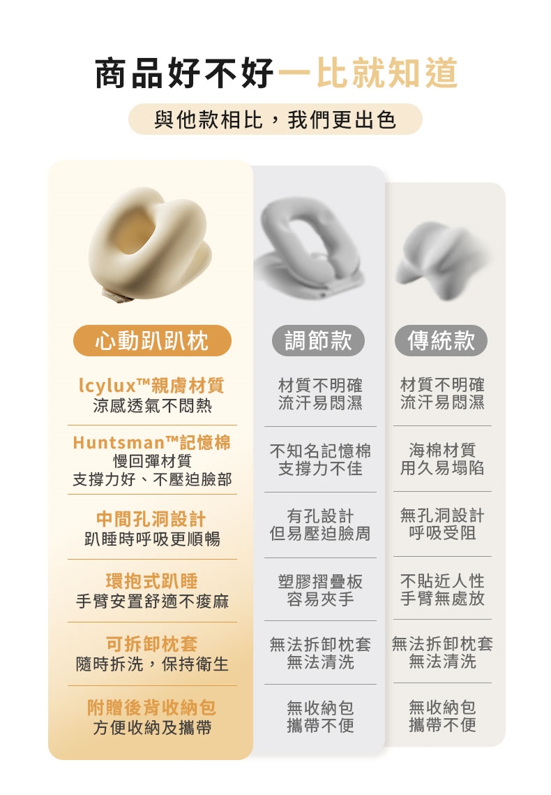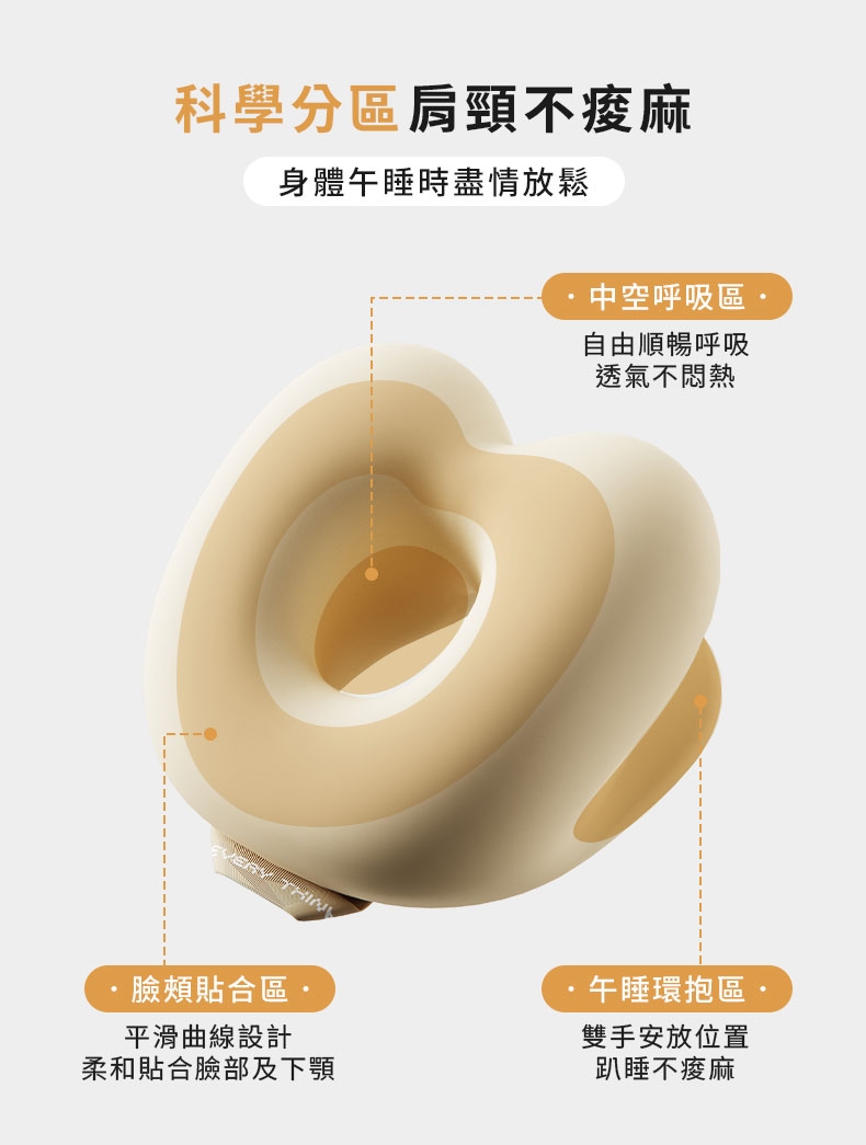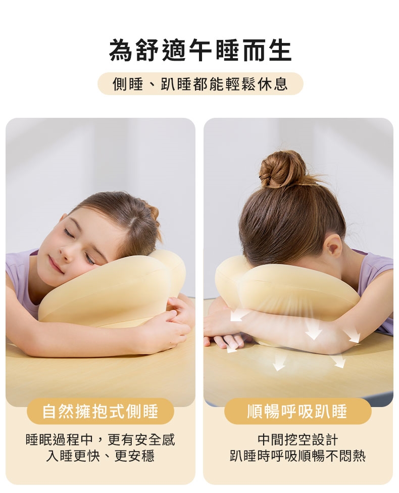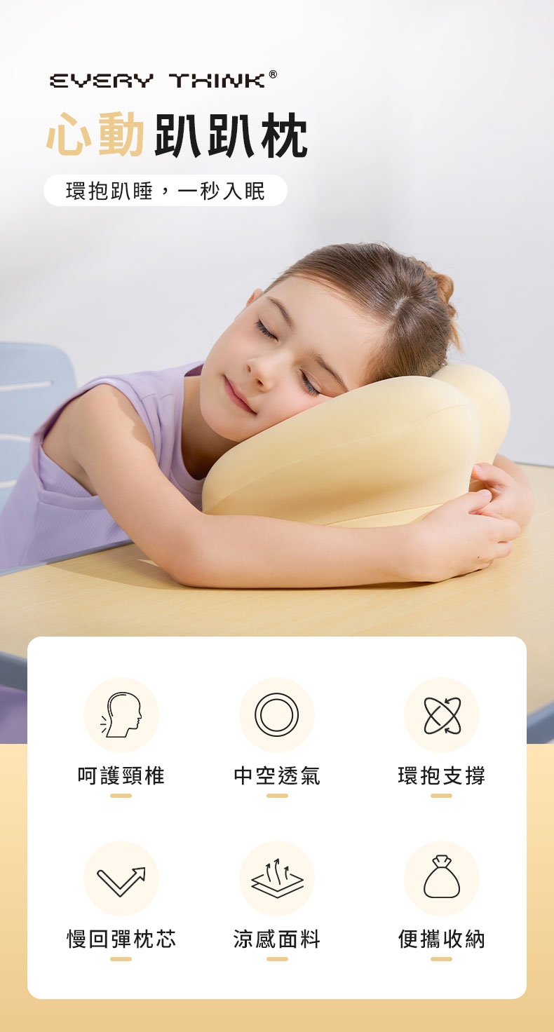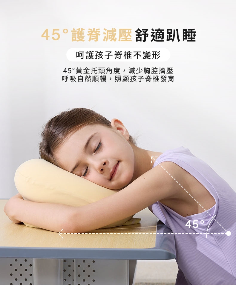 專為趴睡設計,讓你隨時隨地一秒入眠。中空透氣結構搭配環抱式支撐,舒適承托肩頸,減輕壓力。45 度護脊角度有效分散重量,搭配慢回彈枕芯,臉部不受壓迫,睡眠更自在。涼感透氣面料,長時間使用依然清爽不悶熱。枕套可拆洗,搭配手提織帶設計,外出攜帶方便,隨時享受專屬放鬆時刻。