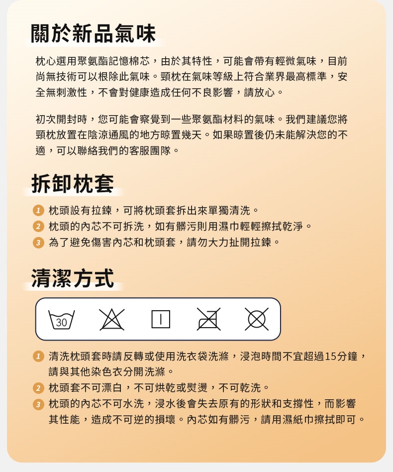 2. 枕頭套不可漂白,不可烘乾或熨燙、不可乾洗。