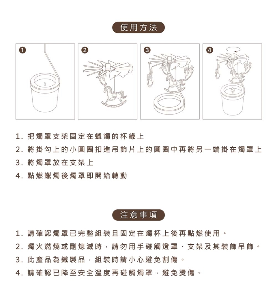 3.蠟燭點燃後,或蠟燭呈液態時,請勿碰觸瓶身,以免燙傷。
