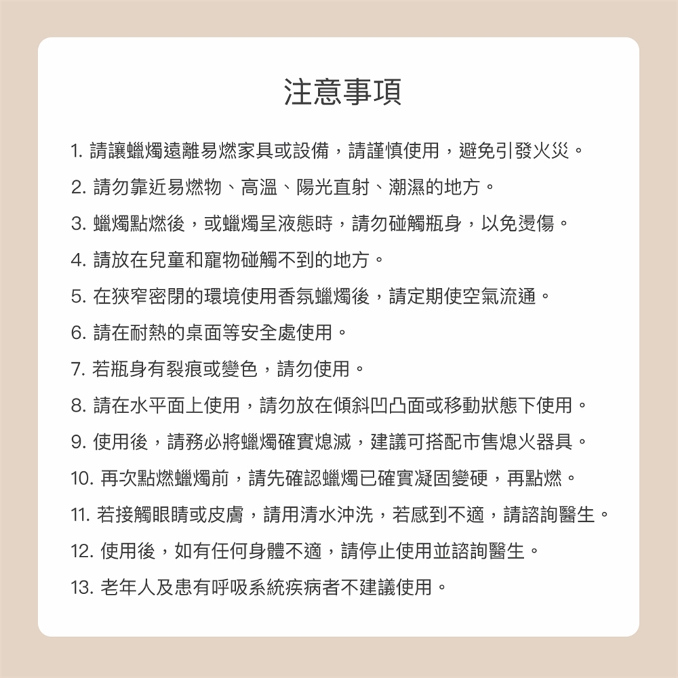 1.請讓蠟燭遠離易燃家具或設備,請慎使用,避免引發火災。