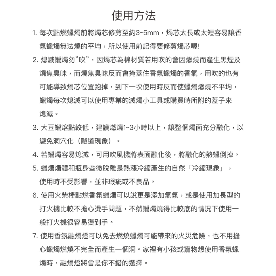 3.大豆蠟熔點較低,建議燃燒1~3小時以上,讓整個燭面充分融化,以
