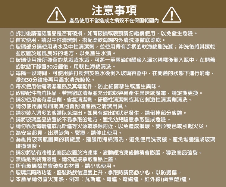 ◎玻培無隔熱功能,盛装熱飲後溫度上升,拿取時請務必小心,以防燙傷。