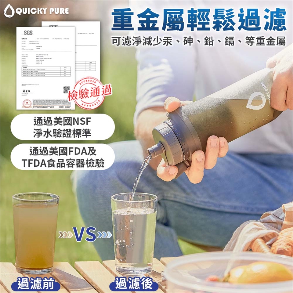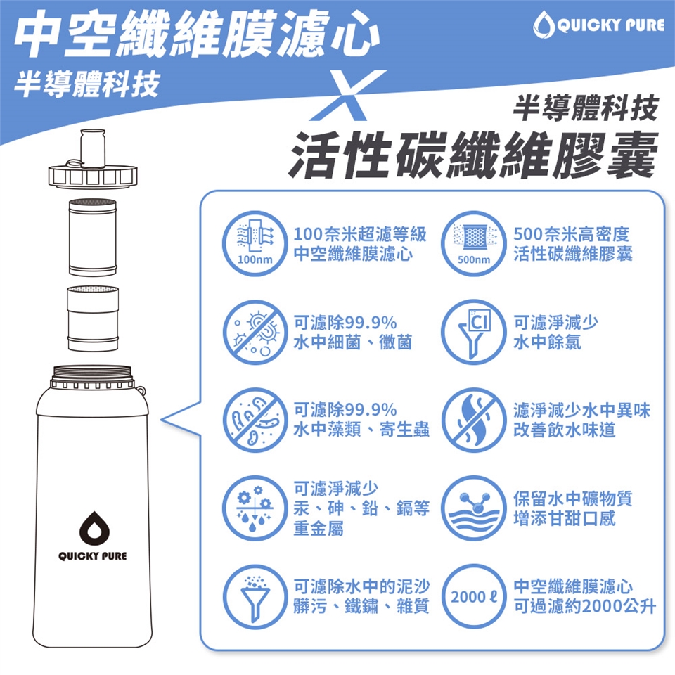 二、本產品並無法百分之一百完全隔絕過濾所有的微生物、病毒、化學物質及重金屬、鹽水等溶於水中的汙染物質,請慎選水源,使用者仍有可能需要承受一定的風險(※取用的水質中可能有物質超過濾芯所能去除的極限)。