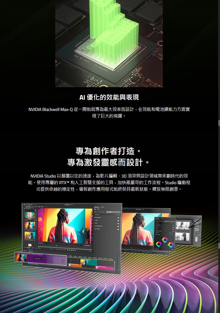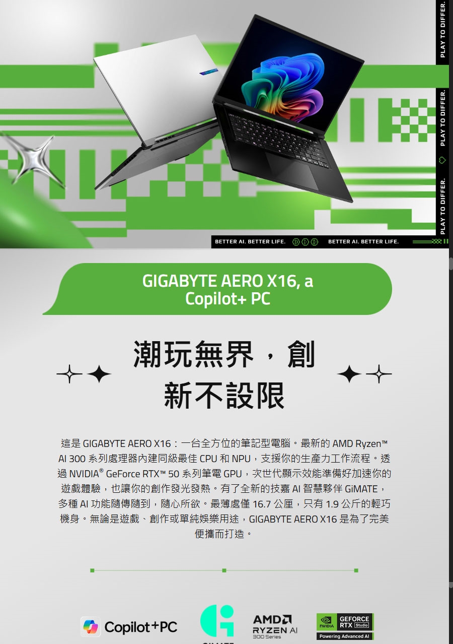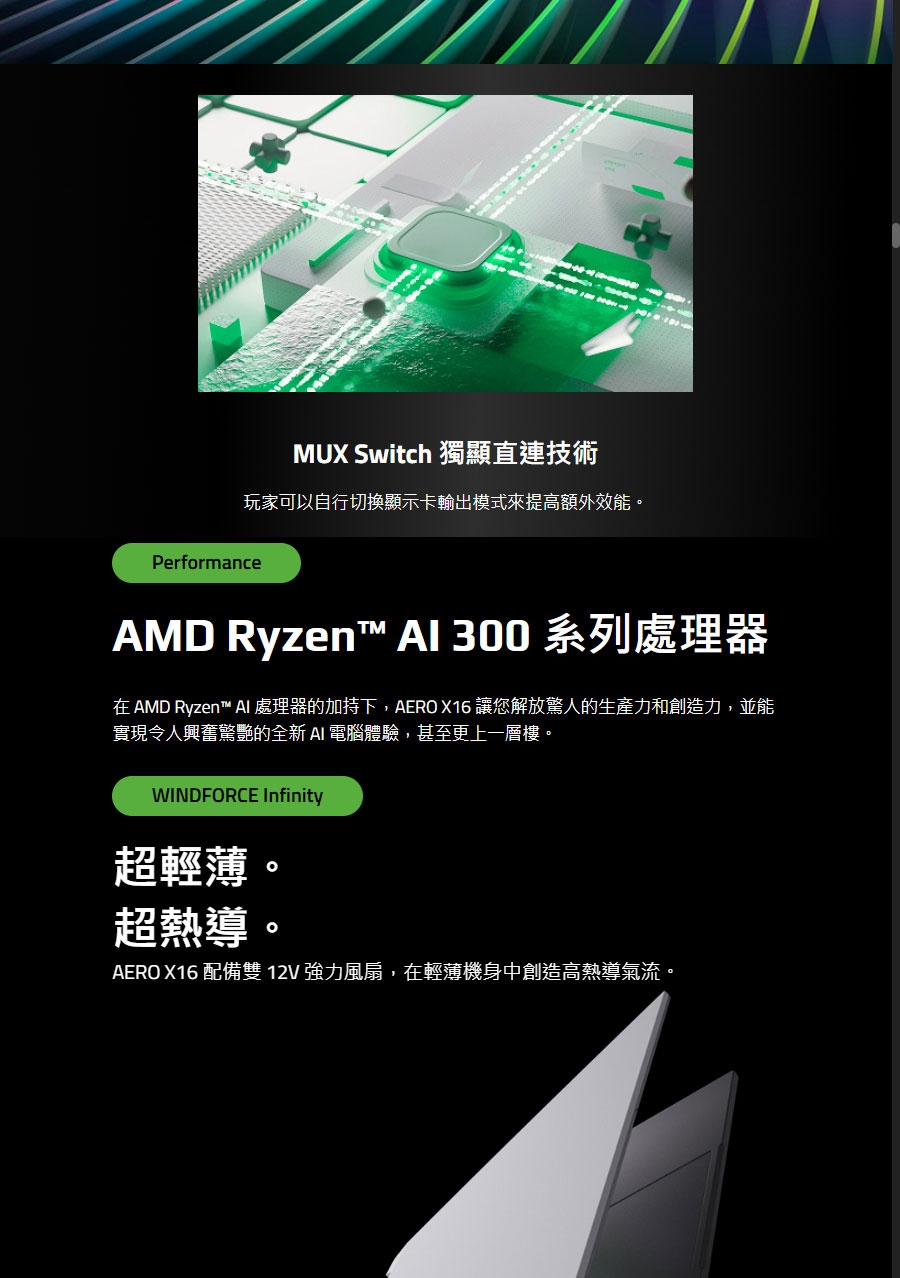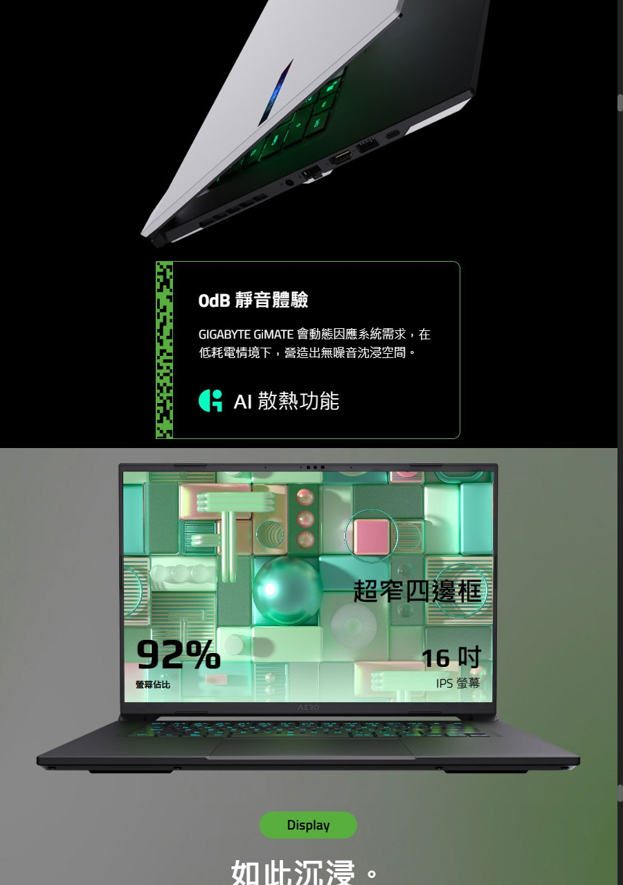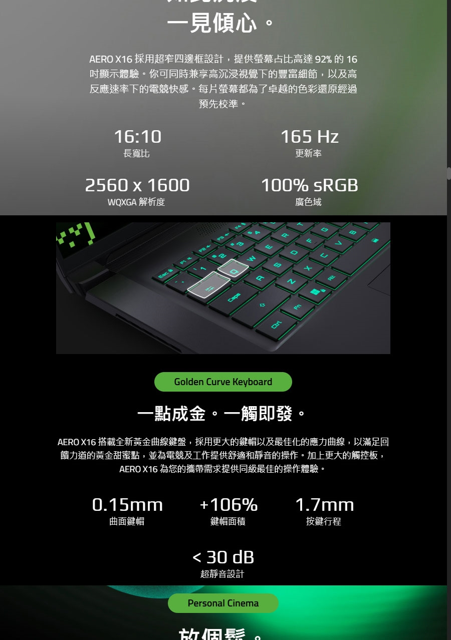 | 顯示器 | 16" 16:10 IPS WQXGA (2560×1600) 165Hz, 3ms, sRGB 100%, 400nits (typical) MUX Switch Pantone® Validated TÜV Rheinland Low Blue Light |