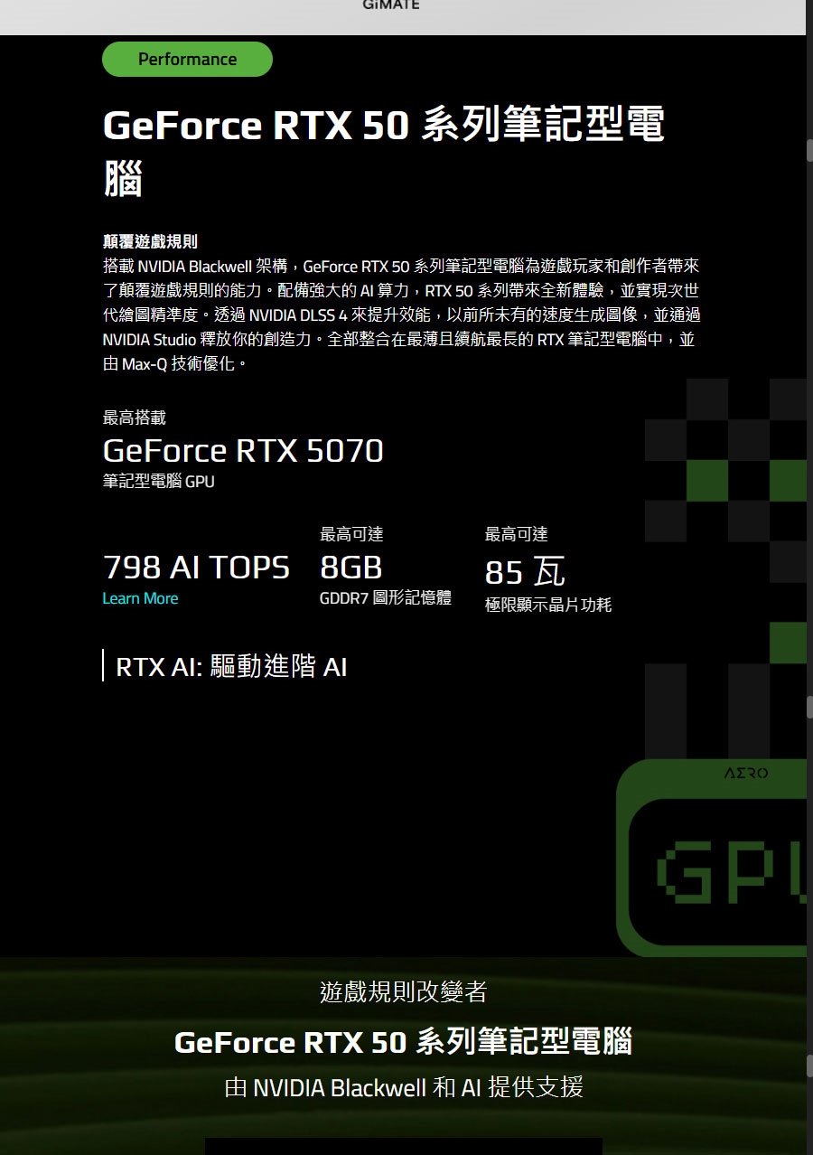 | 顯示晶片 | NVIDIA® GeForce RTX 5070 Laptop GPU 8GB GDDR7 Max. TGP 85W (with Dynamic Boosts) Support MUX Switch |