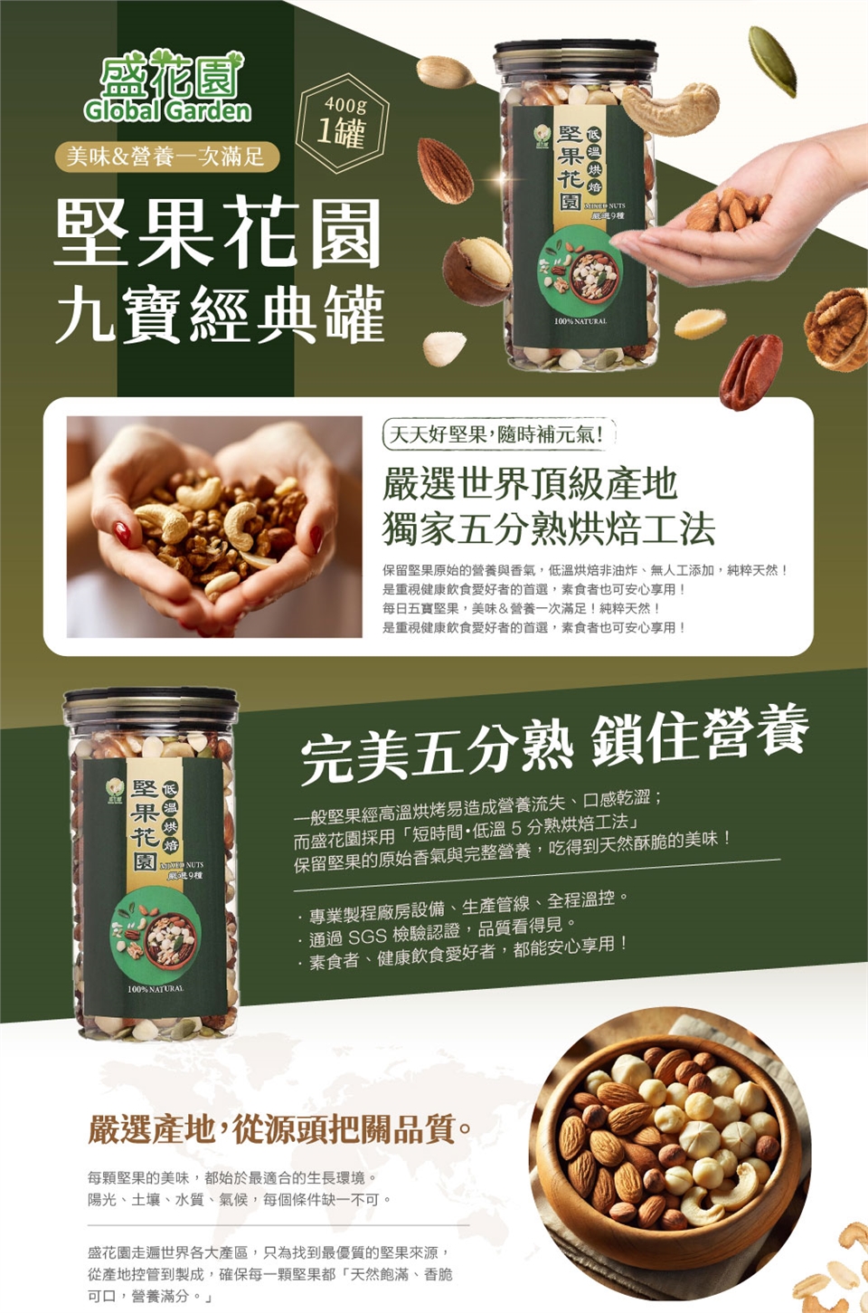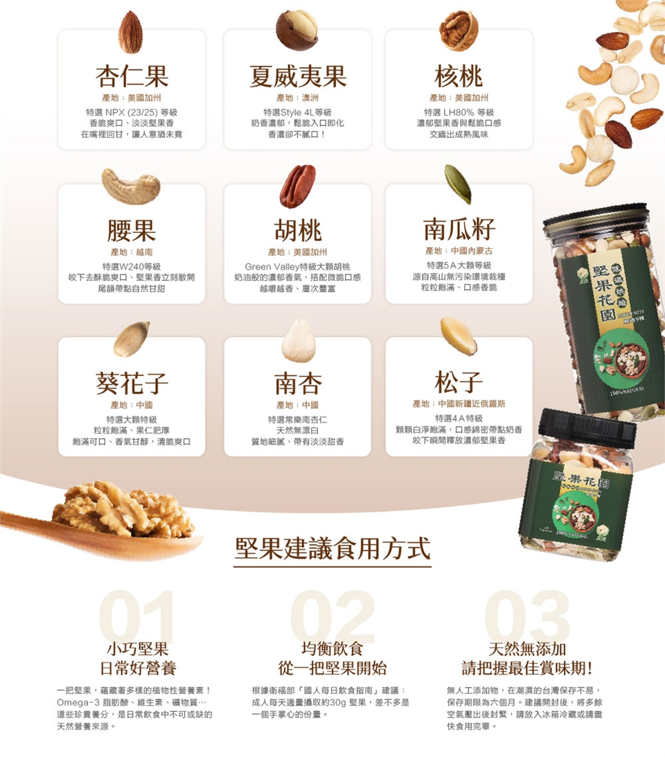 堅果花園九寶經典罐:本產品含有堅果,不適合其過敏體質者食用。