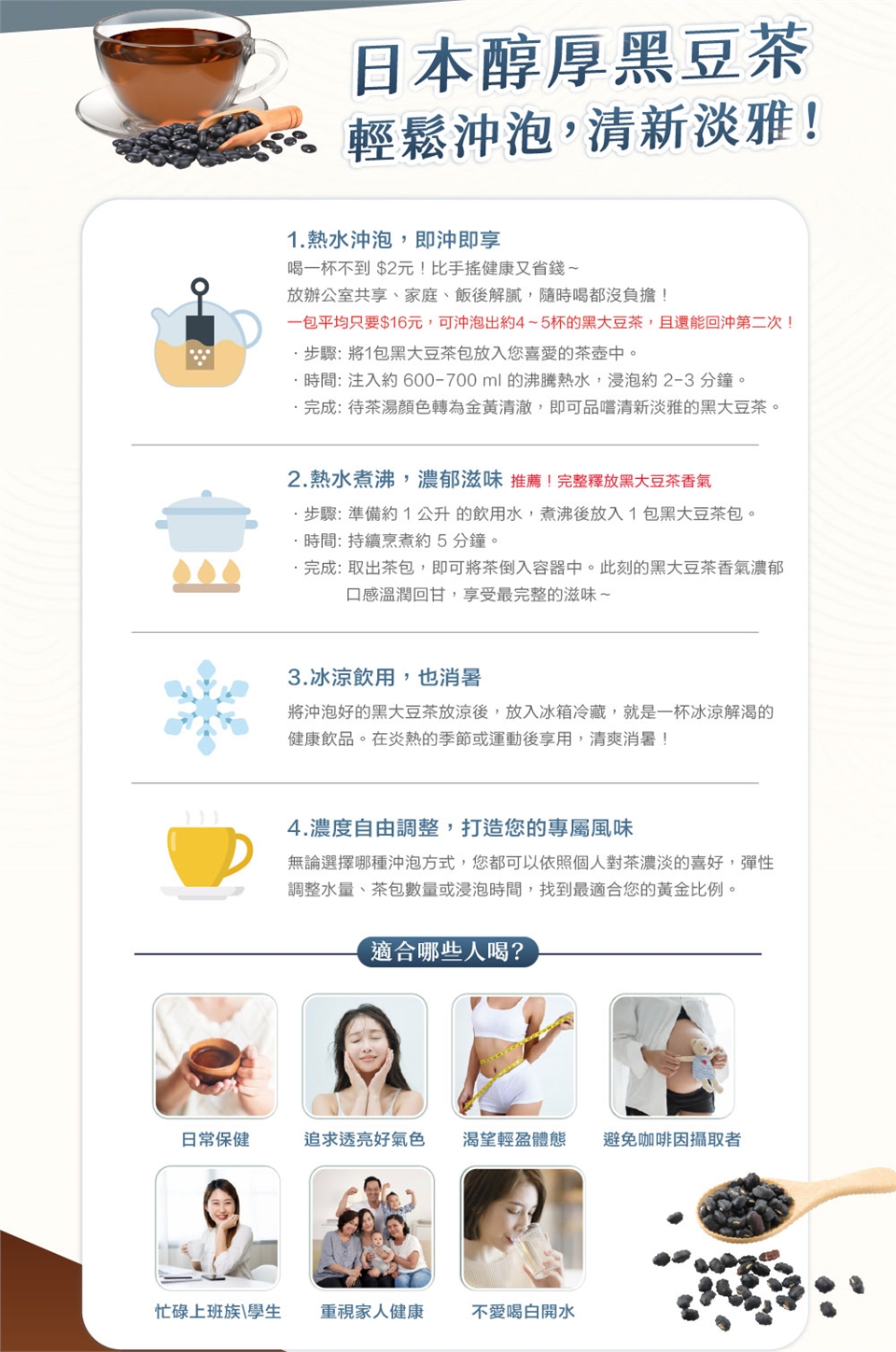 茶包設計,沖泡簡單,溫潤豆香,甘甜順口。