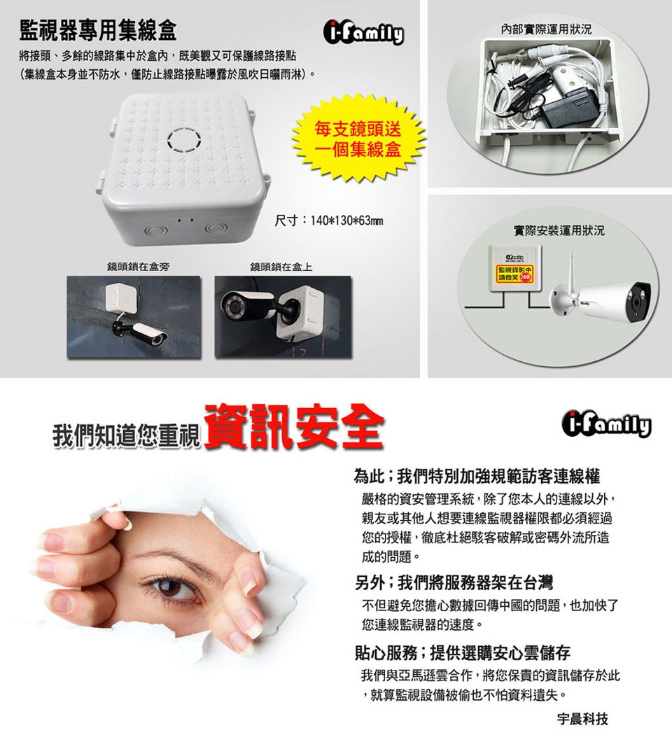 ※每支鏡頭附贈集線盒一個,除了美觀外還保護電源接頭免受風雨侵蝕;