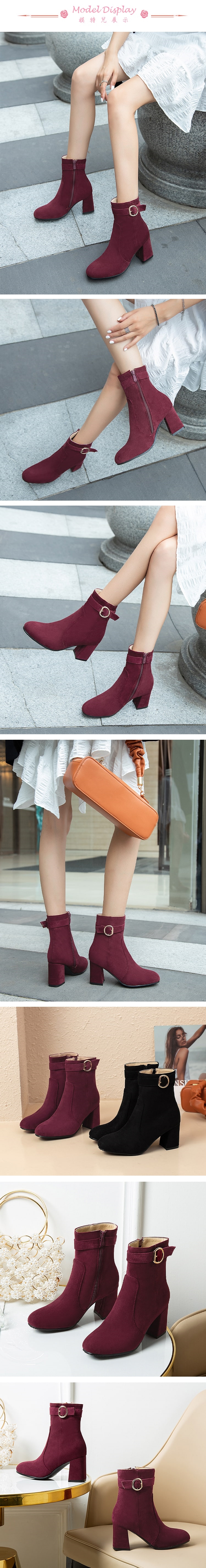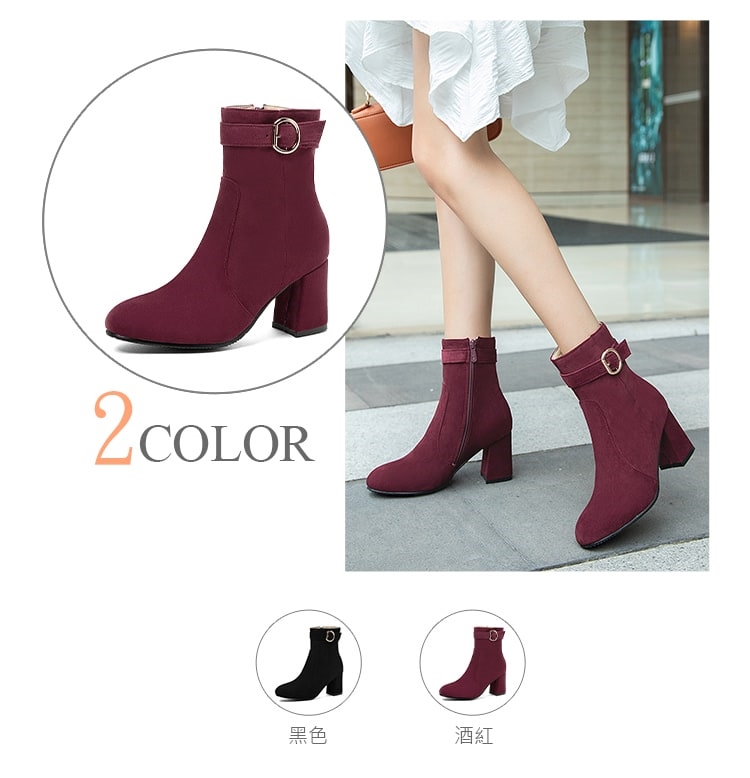 【Kissxxx】翻絨皮帶釦粗跟短靴/質感翻絨皮帶釦飾造型小圓頭粗跟短靴 女鞋 酒紅