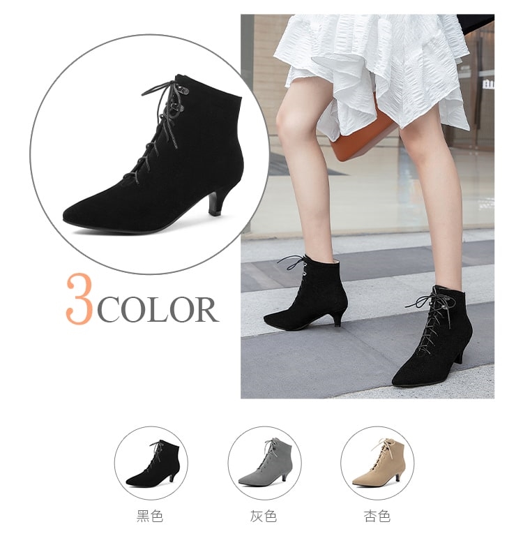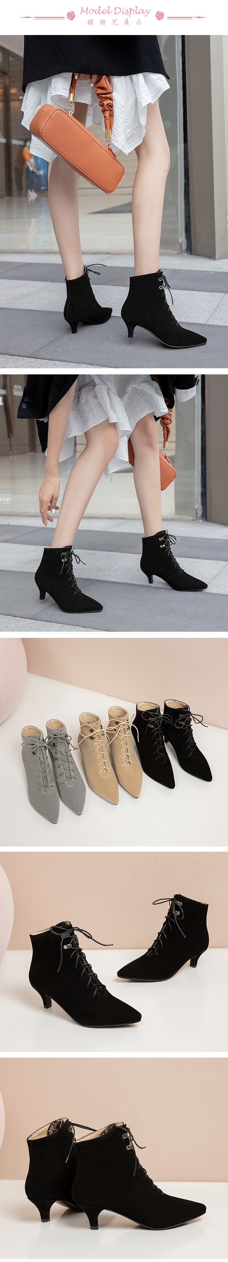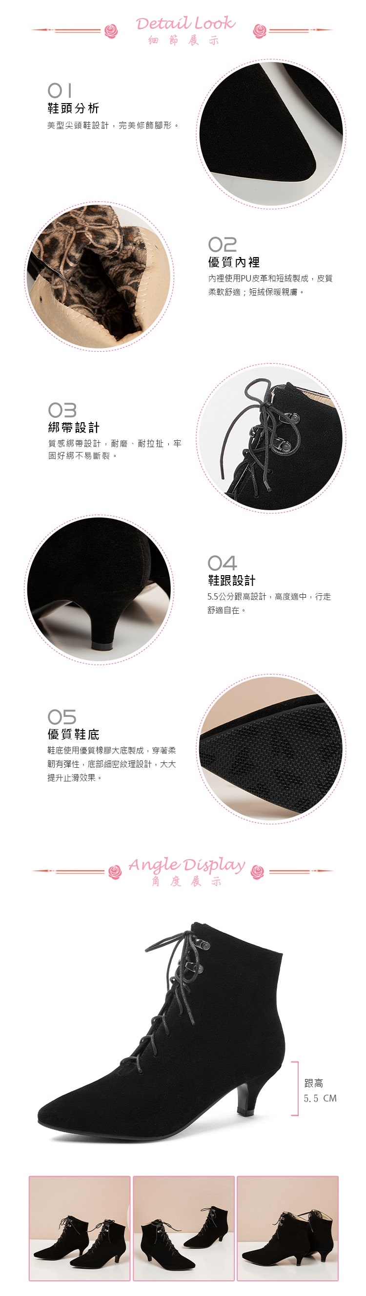 【Kissxxx】絨面尖頭綁帶低跟短靴/復古英倫風質感絨面尖頭綁帶造型低跟短靴 女鞋 黑