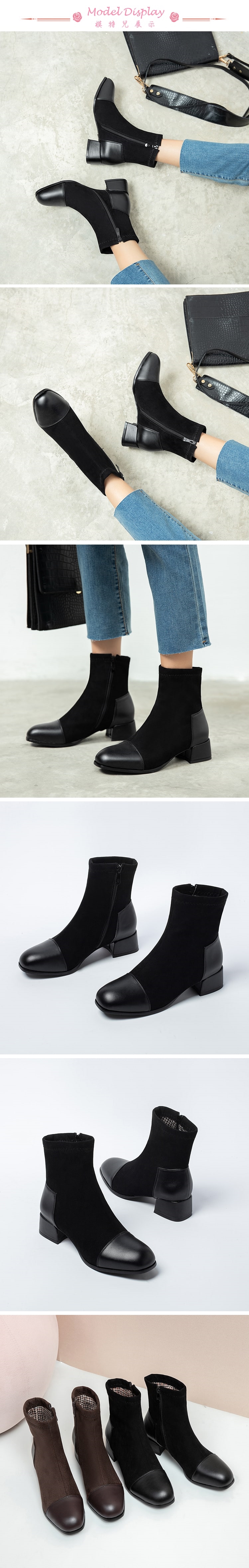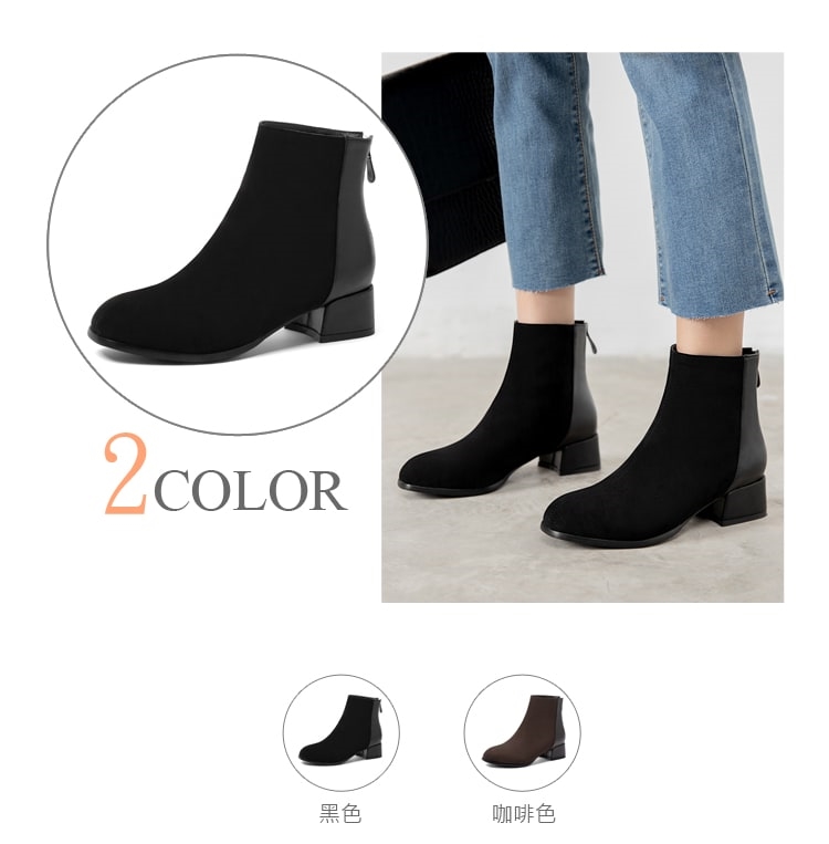 【Kissxxx】小方頭拼接素面粗跟短靴/經典小方頭異材質拼接素面百搭粗跟短靴 女鞋 黑