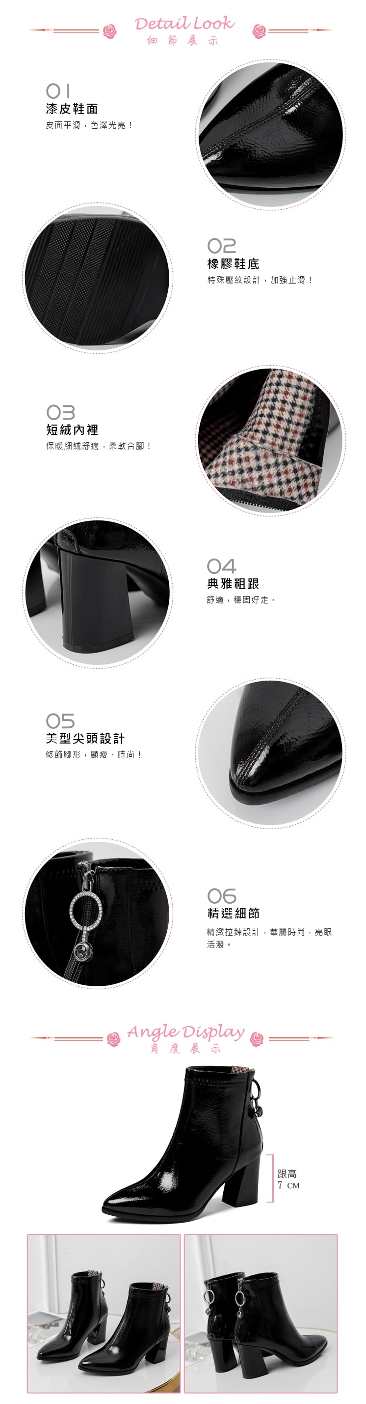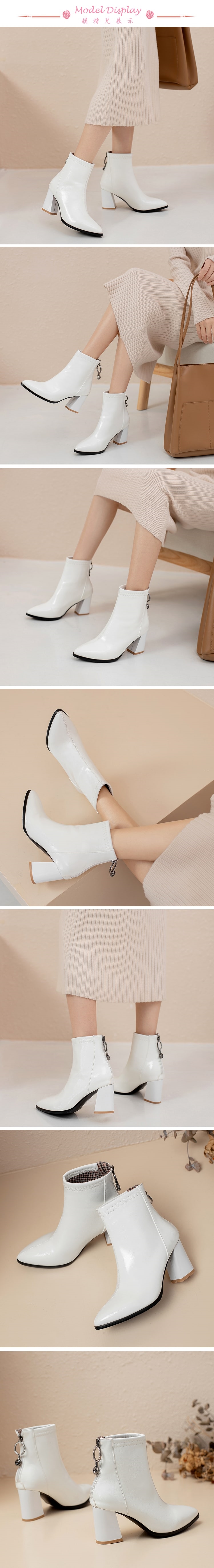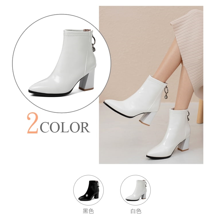 【Kissxxx】尖頭漆皮亮面後拉鍊粗跟短靴/美腿效果尖頭漆皮亮面復古後拉鍊造型粗跟短靴 女鞋 白