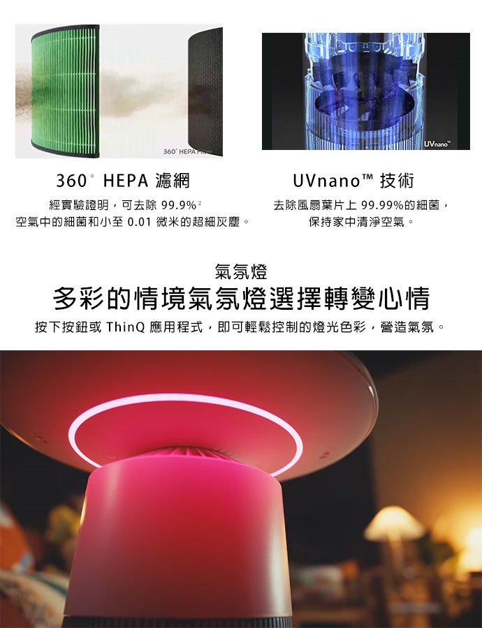 ★360˚ 空氣淨化:360˚ HEPA 濾網,UVnano™ 技術