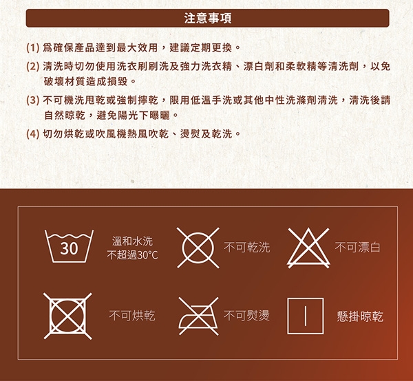 3.不可機洗甩乾或強制擰乾,限用低溫手洗或其他中性洗滌劑清洗,清洗後請自然晾乾,避免陽光下曝曬。
