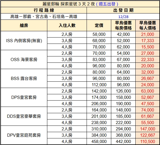 ※ 變更後之訂位已不適用原優惠內容,須以新訂位當時適用之艙房價格計算。