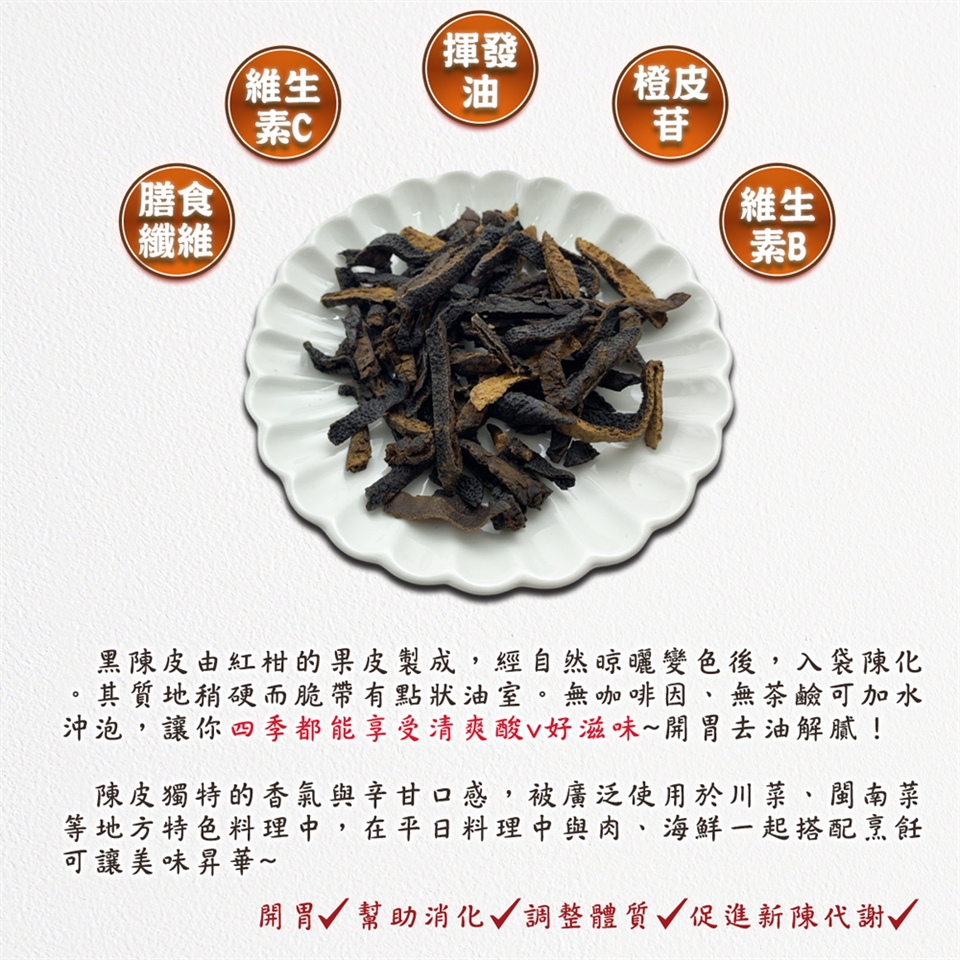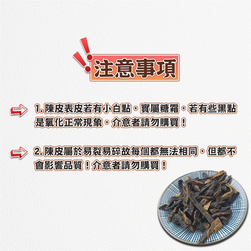 1.陳皮表皮若有小白點,實屬糖霜,若有些黑點是氧化正常現象,介意者請勿購買!