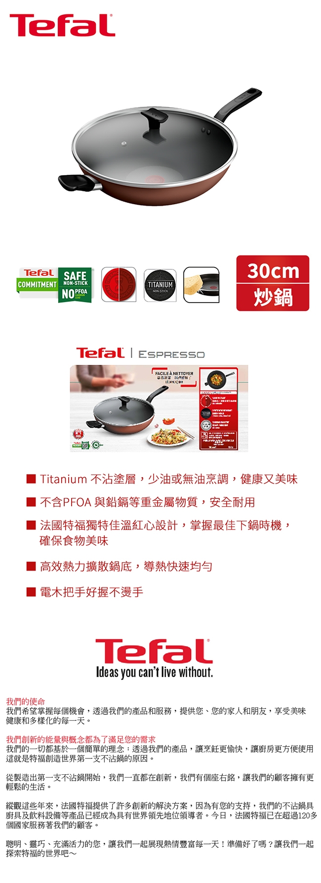 材質:鋁合金、TITANIUM鈦合金強化塗層(PTFE,耐熱溫度250°C)、電木把手、耐熱玻璃蓋