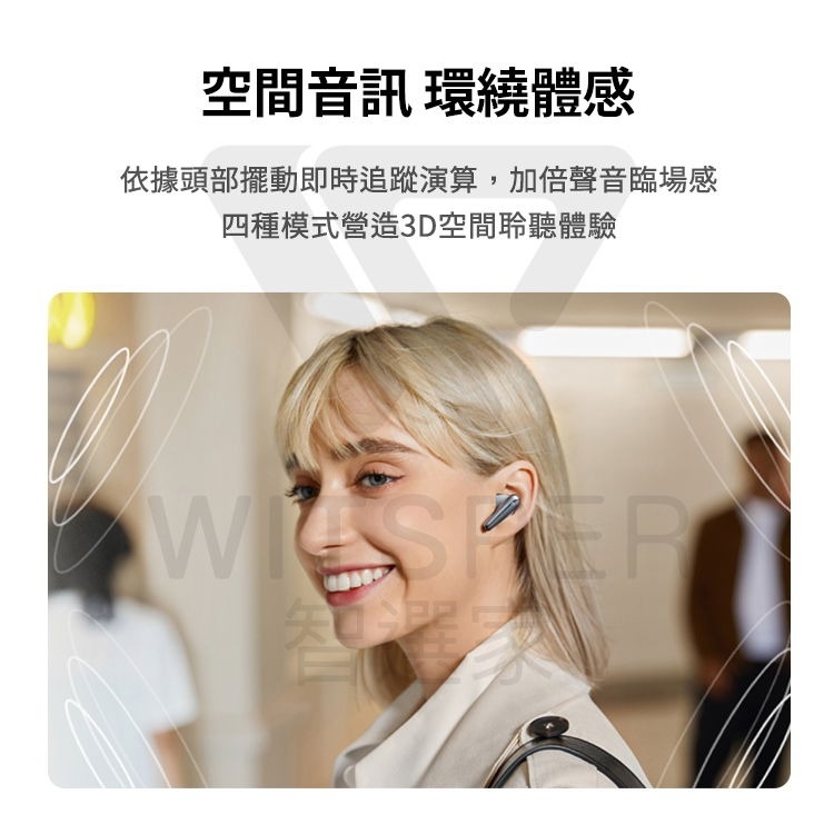 - 空間音訊 環繞體感|依據頭部擺動即時追蹤演算,加倍聲音臨場感,營造3D空間聆聽體驗