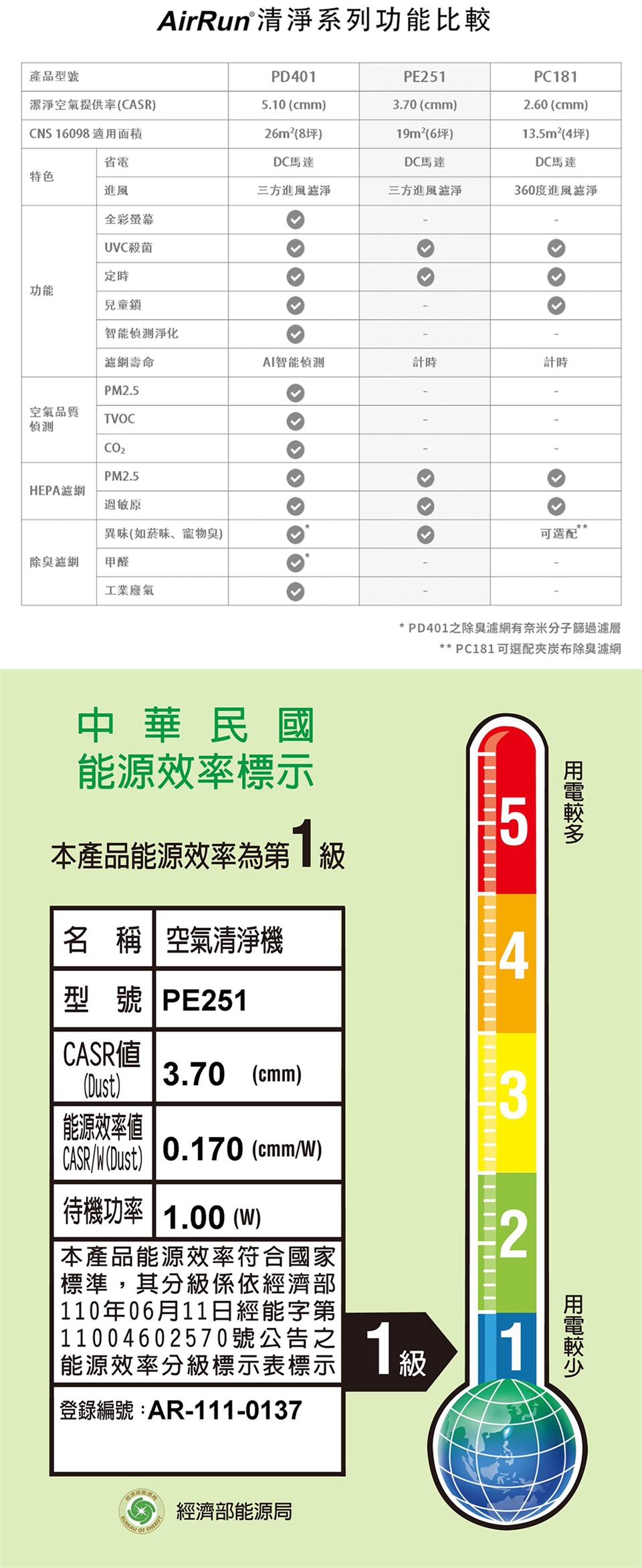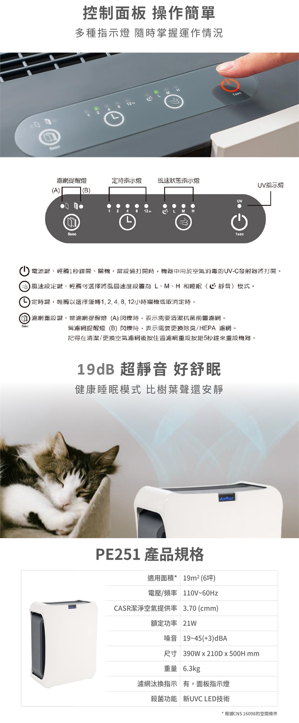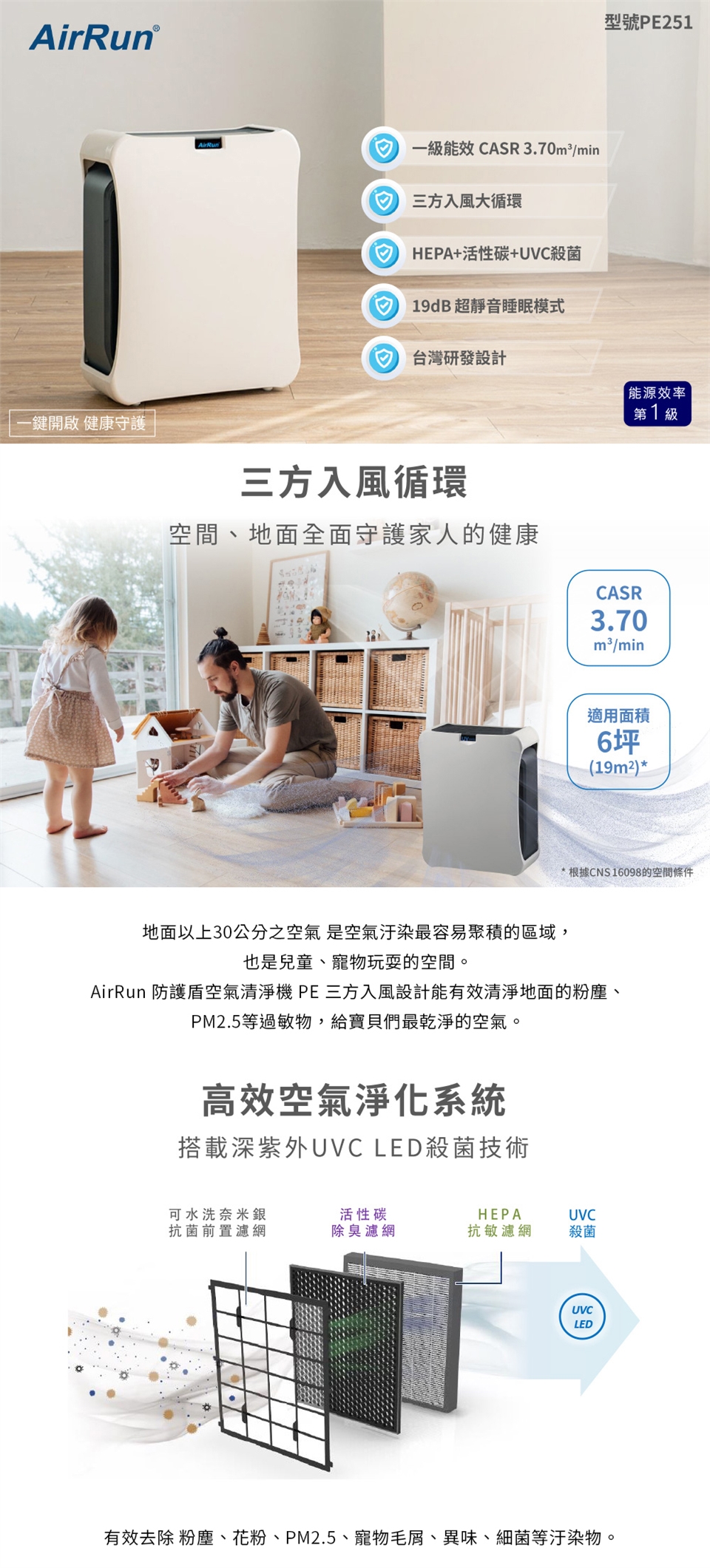 可水洗奈米銀濾網+活性碳除臭濾網+HEPA抗敏濾網,搭載深紫外UVC LED殺菌技術,有效去除粉塵、花粉、PM2.5、寵物毛屑、異味、細菌等污染物。 3段風速調整,可定時關機,通過計時方式提醒清潔或更換濾網。三方入風大循環,一級能效,CASR 3.70(cmm)。